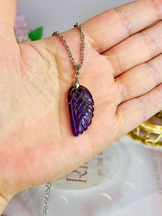 Amethyst Carved Angel Wing Necklace In Gift Bag