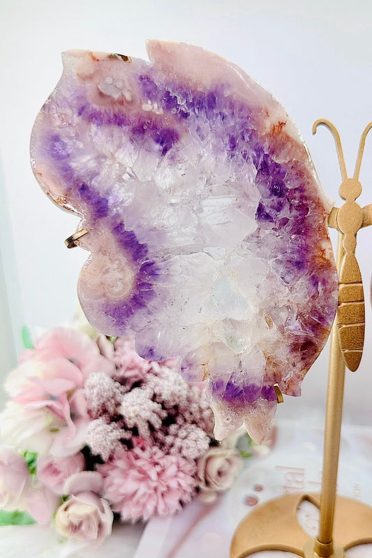 Classy & Fabulous Large Rare Amethyst X Flower Agate Carved Butterfly Wings On Gold Stand 24cm From Brazil