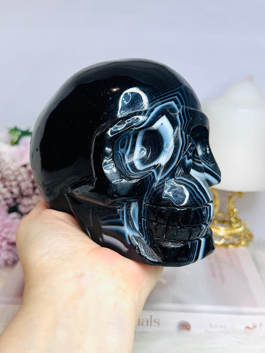 Huge Black Striped Agate Carved Skull 1.85KG 13cm