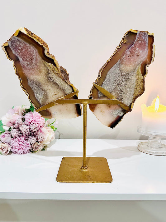 Huge 29.5cm (Inc Stand) Gorgeous Pink Amethyst Agate Wings On Gold Stand From Brazil