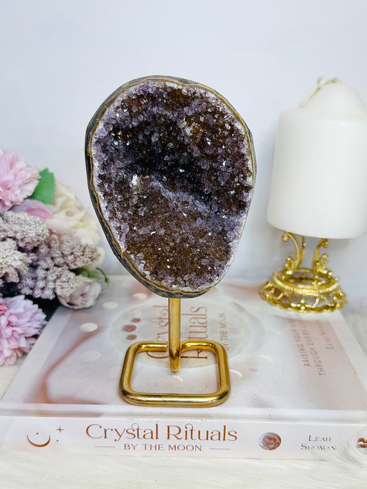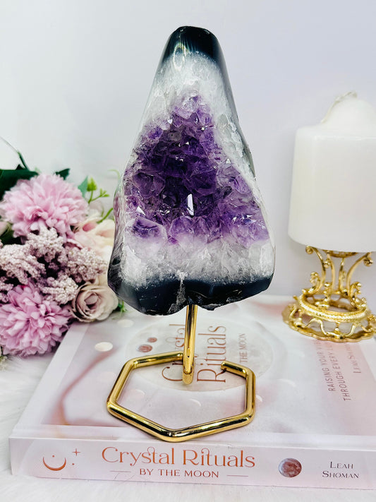 Large 20cm 1.1KG Natural Amethyst Agate Cluster Freeform on Gold Stand