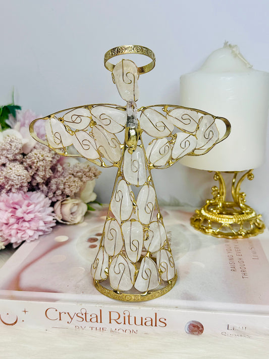 Large 16cm Rose Quartz Gold Angel with Vera Cruz