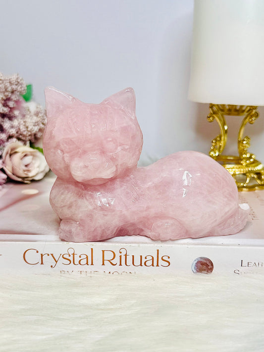 Large Rose Quartz Carved Cat 11cm 488g (Small Chip On Tail)