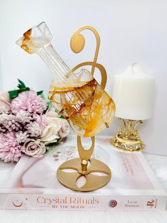 ⚜️ SALE ⚜️ Wow!!! The Golden Guitar ~ Absolutely Stunning Large 20cm (Inc Stand) High Grade Golden Healer Guitar Carving on Gold Music Stand
