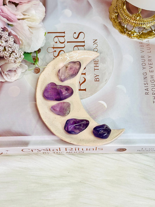 Hand Crafted 11cm Ceramic Moon with High Grade Amethyst Tumbles