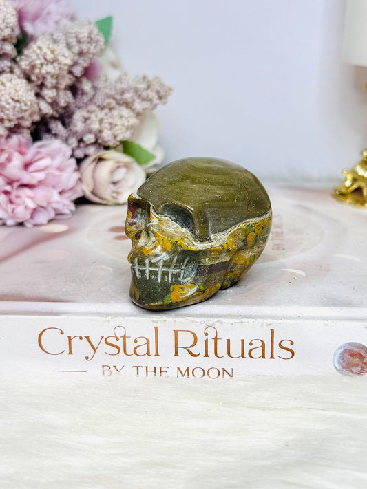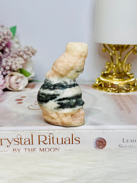 Pink Zebra Jasper Skull with Owl 7.5cm