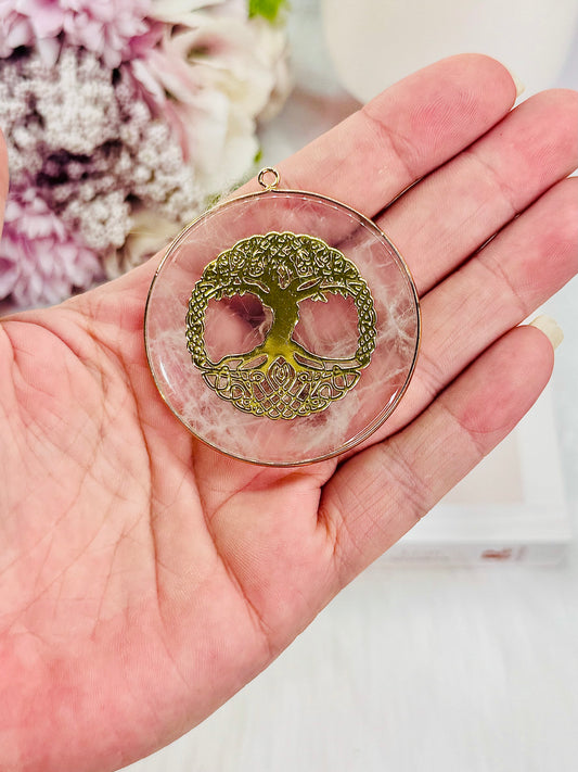 Self Love ~ Beautiful Rose Quartz Pendant with Gold Tree of Life Print In Gift Bag
