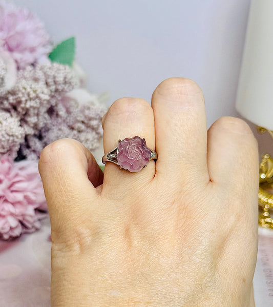 Purple Fluorite Rose Carved Adjustable Ring in Gift Bag