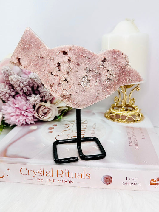 Large Chunky Druzy Pink Amethyst Craved Bird On Stand From Brazil 15cm
