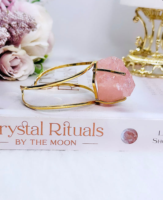 High Grade Raw Rose Quartz Chunky Adjustable Gold Plated Bracelet From Brazil In Gift Bag