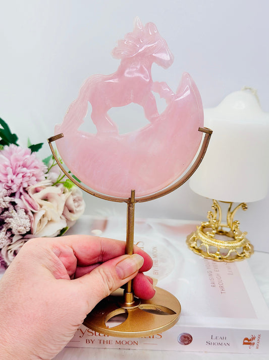 Gorgeous Rose Quartz Carved Rocking Horse On Gold Stand Tall 21cm