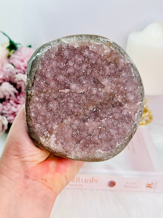 Large Natural 28cm (inc stand) Pink Amethyst Druzy Slab On Rose Gold Stand From Brazil