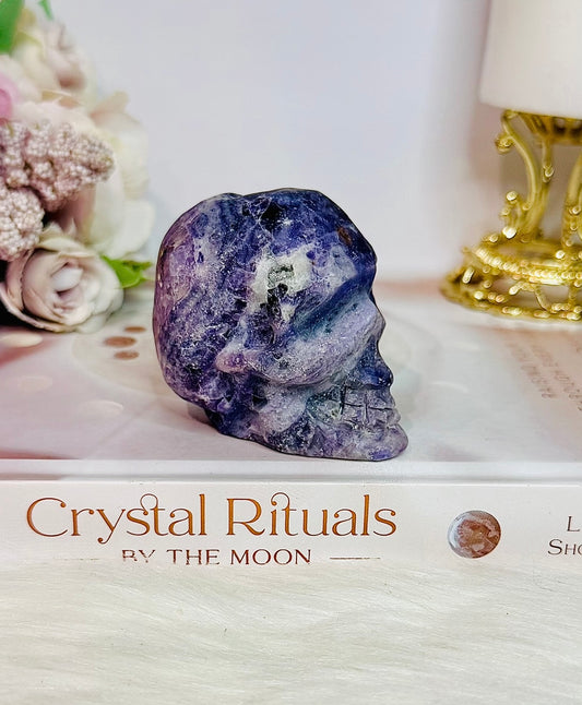 Purple Root Fluorite Carved Skull 288grams