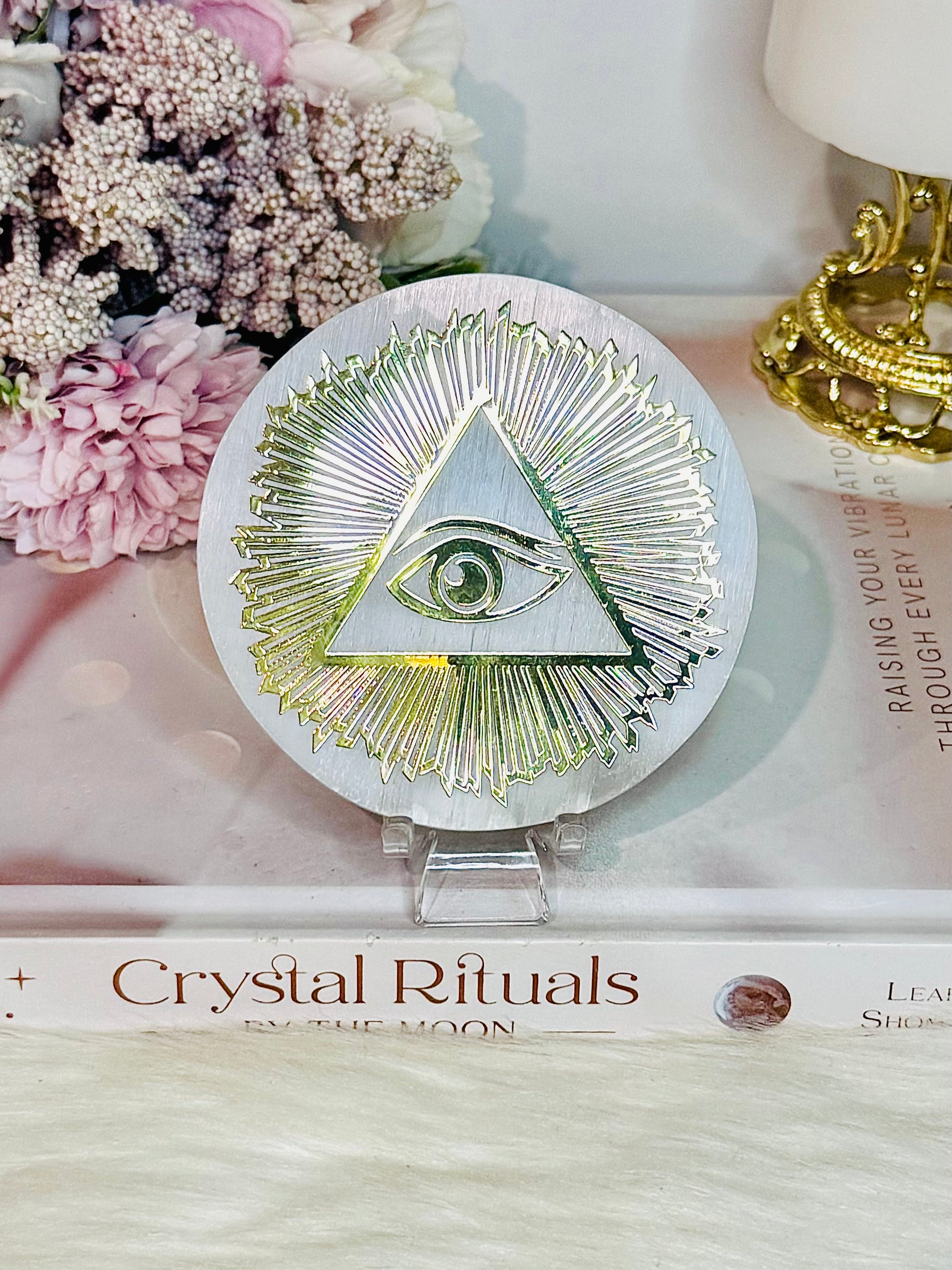 Amazing Selenite Slab with Gold Evil Eye Carving on Stand 8cm