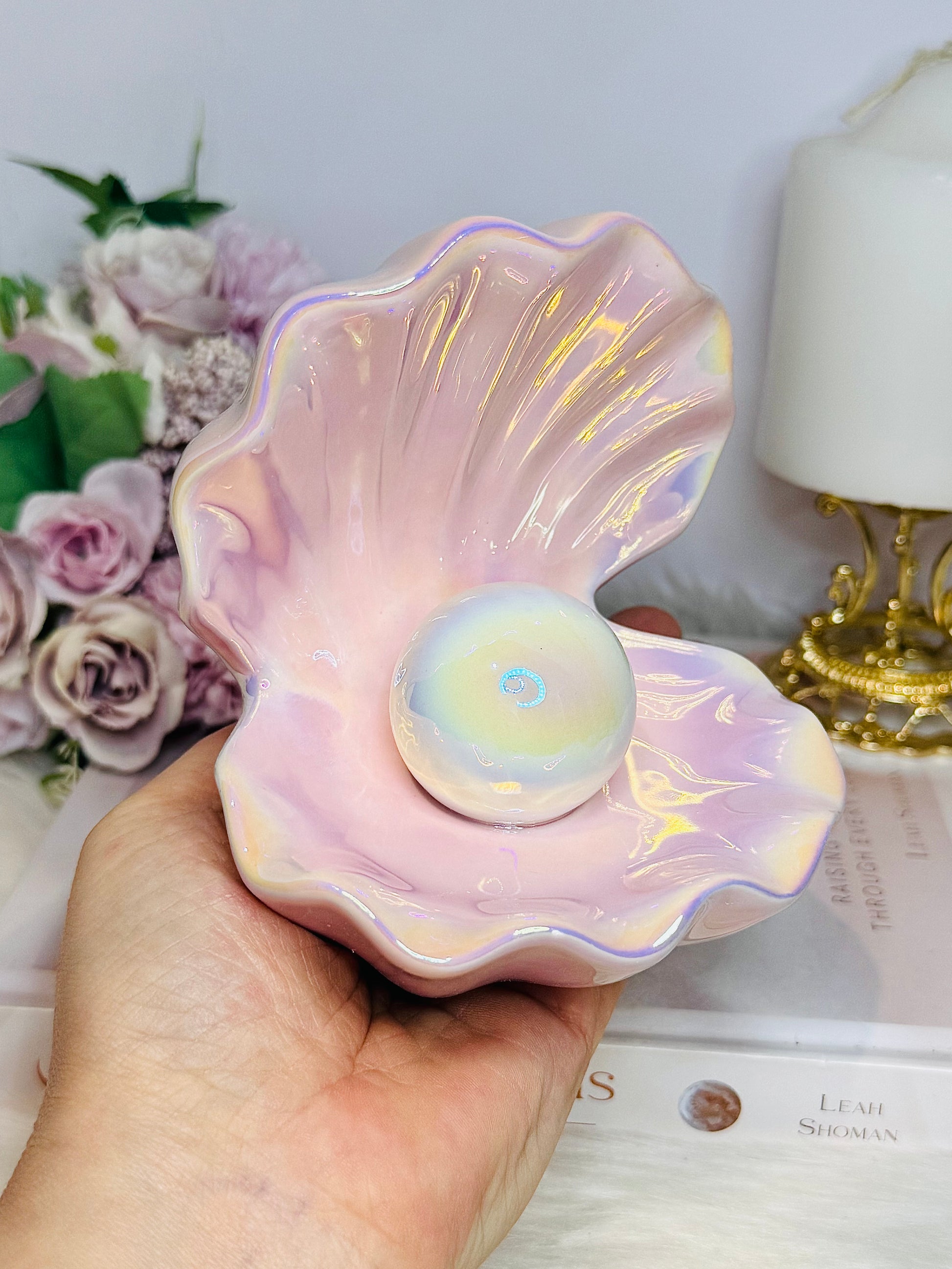 This charming clam shell trinket dish, with its soft iridescent pink finish and a gleaming pearl at its centre. Ideal for storing rings, small keepsakes, or any cherished items, it adds a touch of coastal elegance to your space. Product Size: H10.8cm x W10.4cm x D10.8cm.