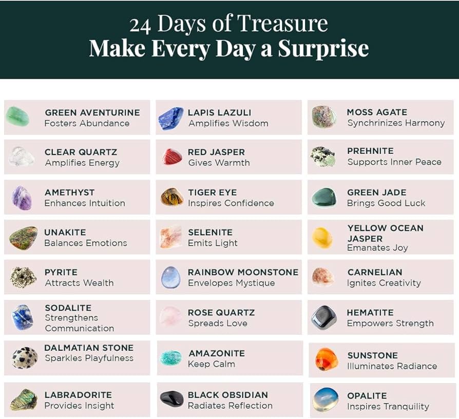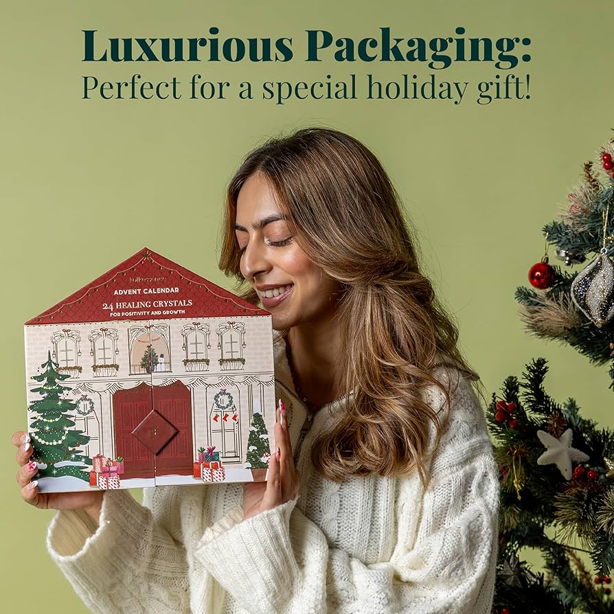 Unveil the magic of discovery with this advent calendar of 24 healing crystals or polished gemstones, each revealing a new mystery stone until Christmas. This advent calendar is housed in a luxurious, house-shaped gift box that opens like a door, this crystal advent calendar set is the perfect christmas gift for those who cherish the beauty of nature and the joy of the holiday season