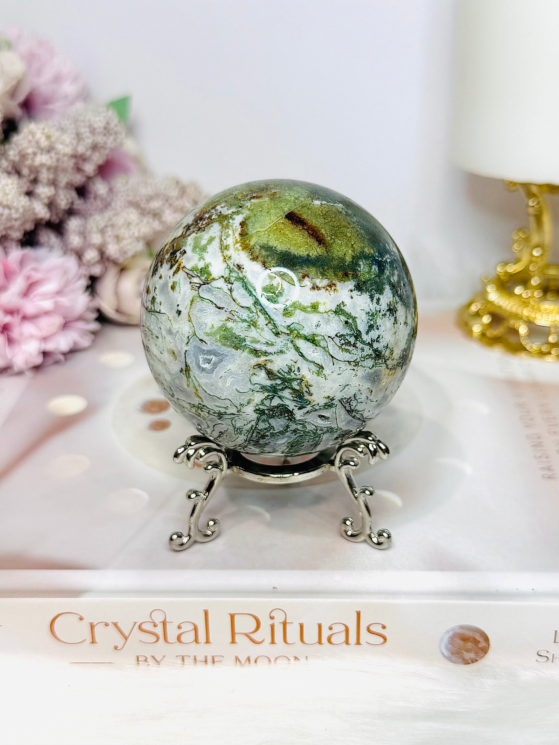 Druzy Moss Agate Sphere on Stand 428g
