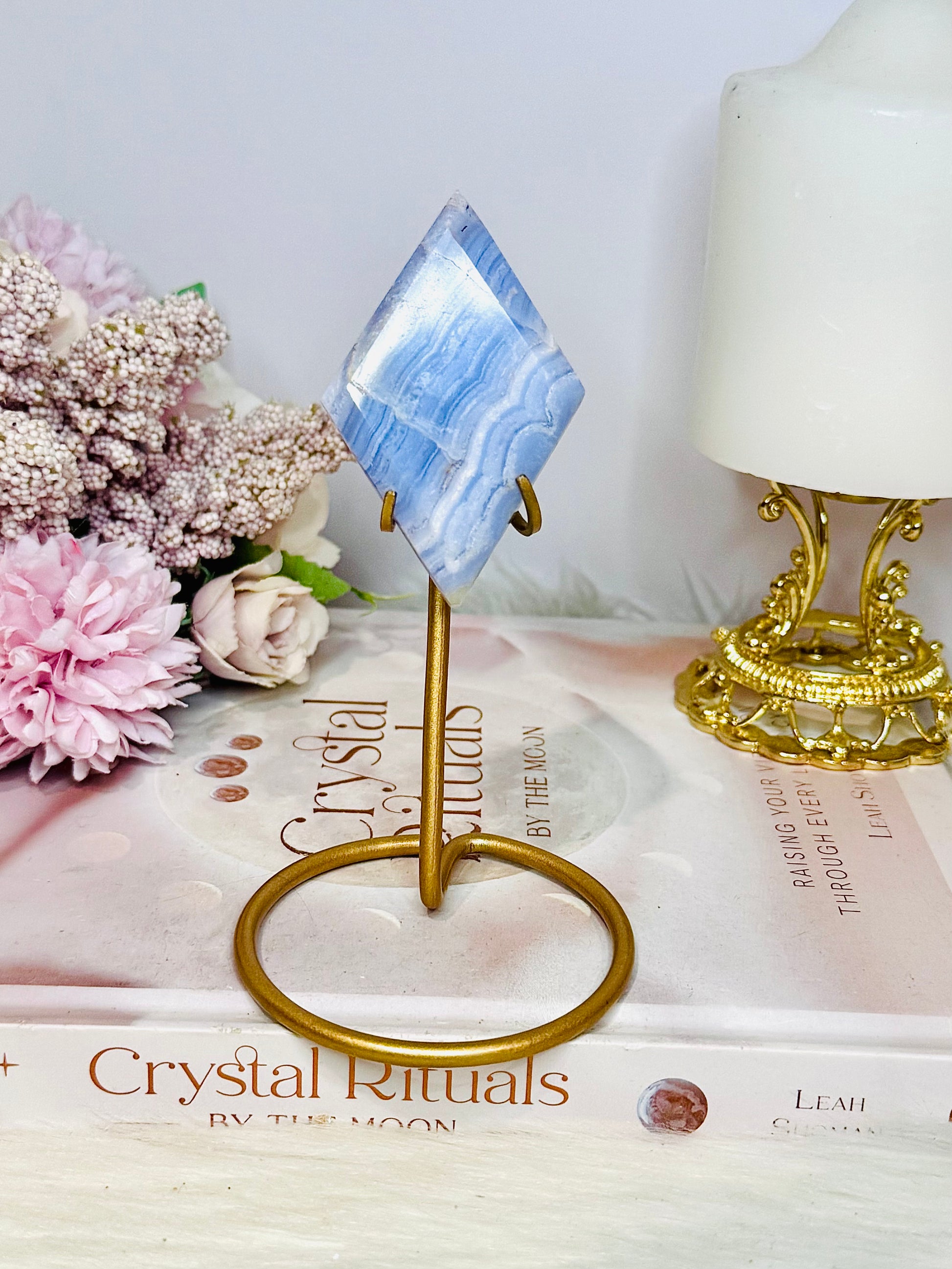 High Grade Blue Lace Agate Carved Diamond On Gold Stand 13.5cm