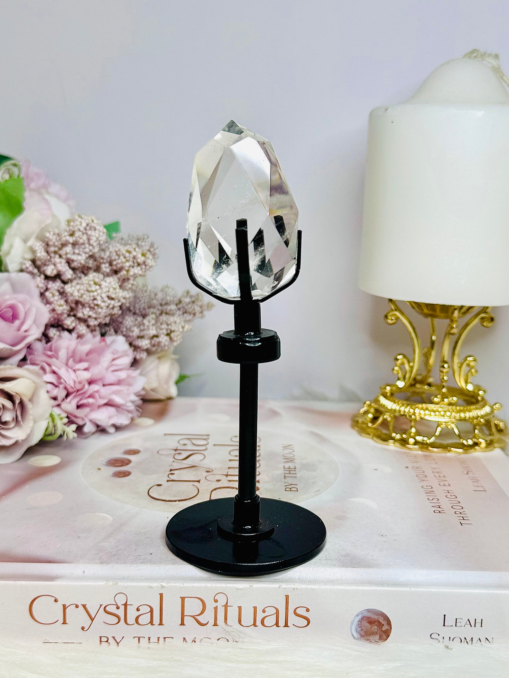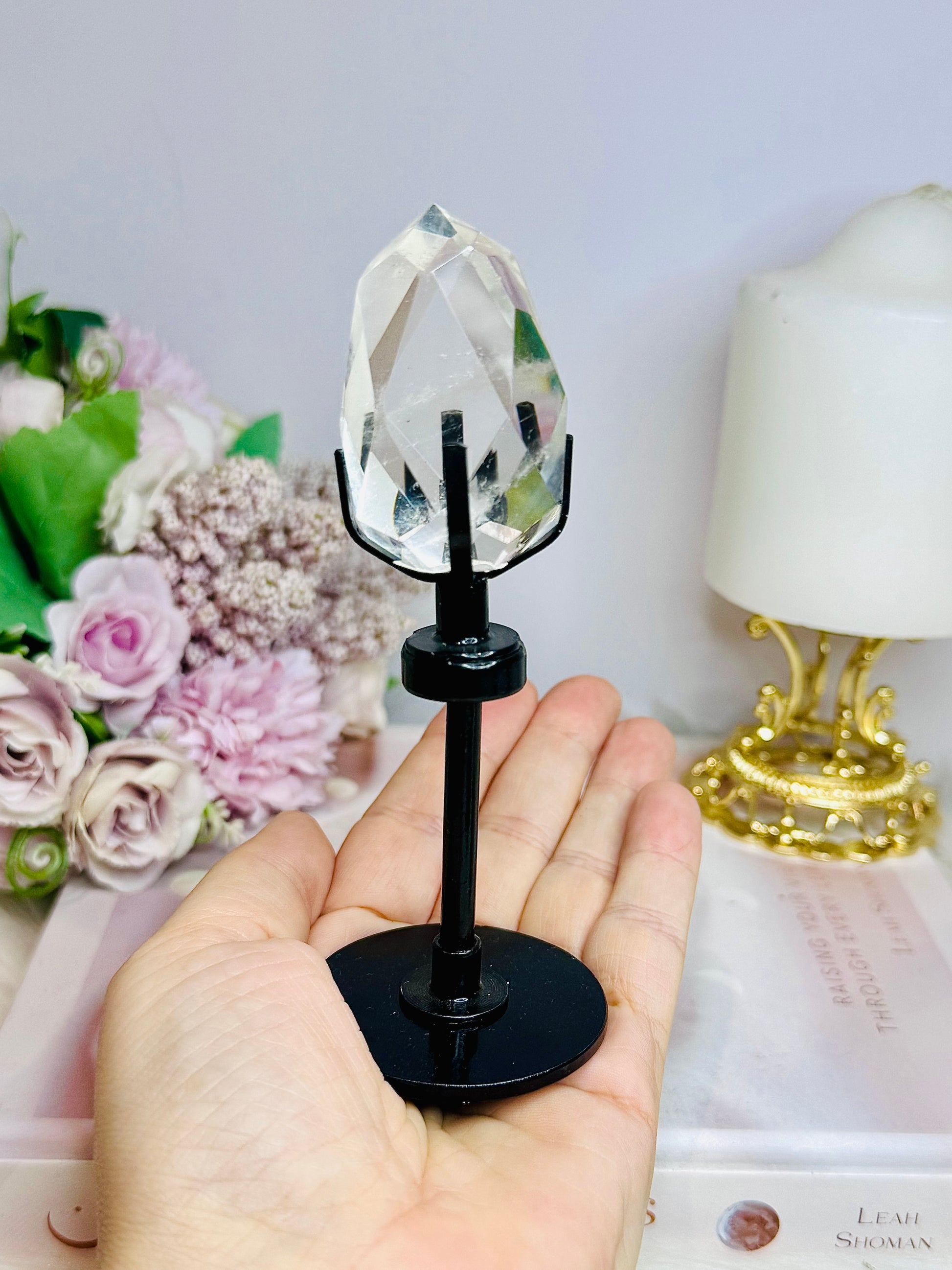 High Grade Clear Quartz Faceted Diamond On Stand 13cm