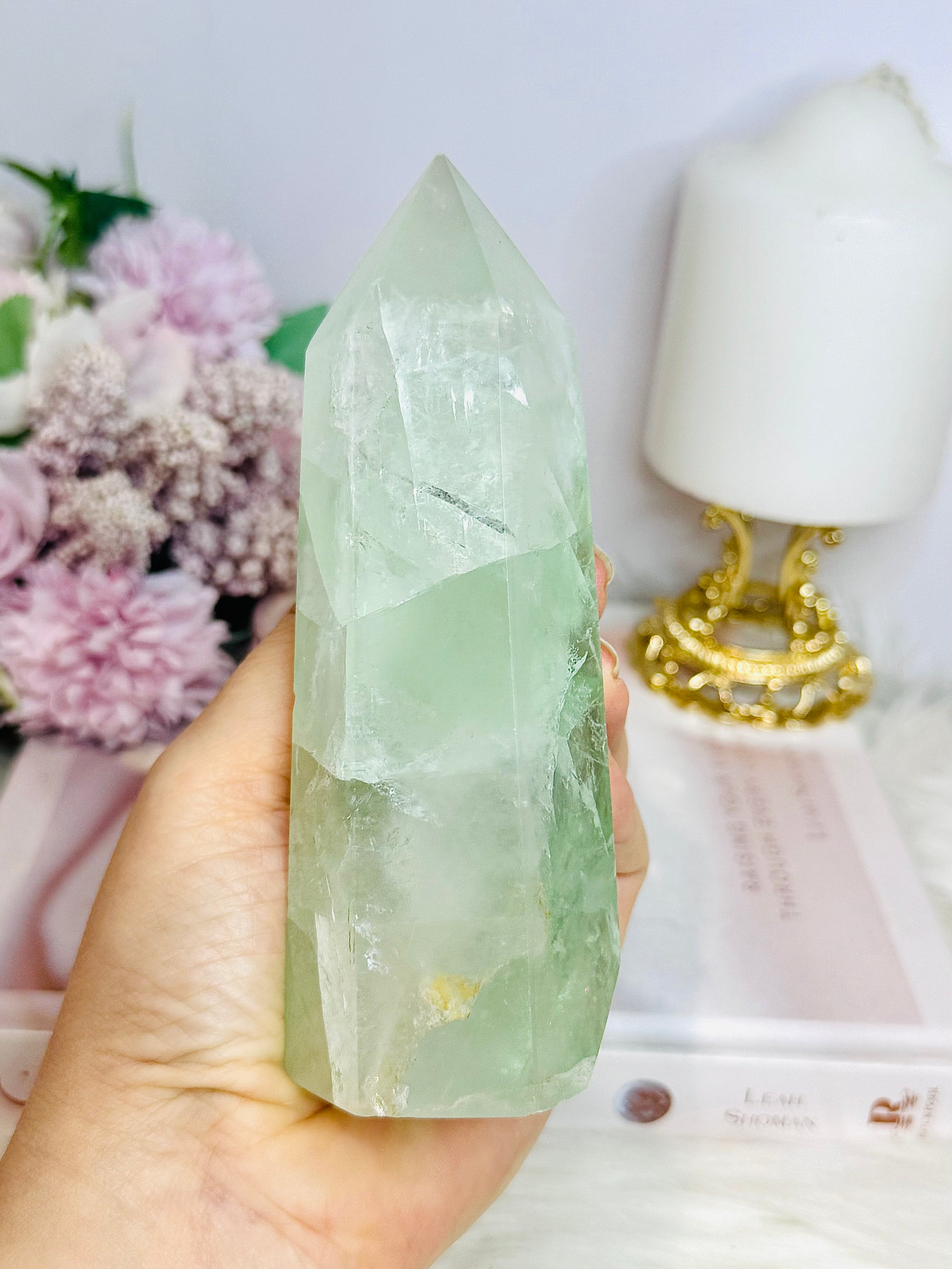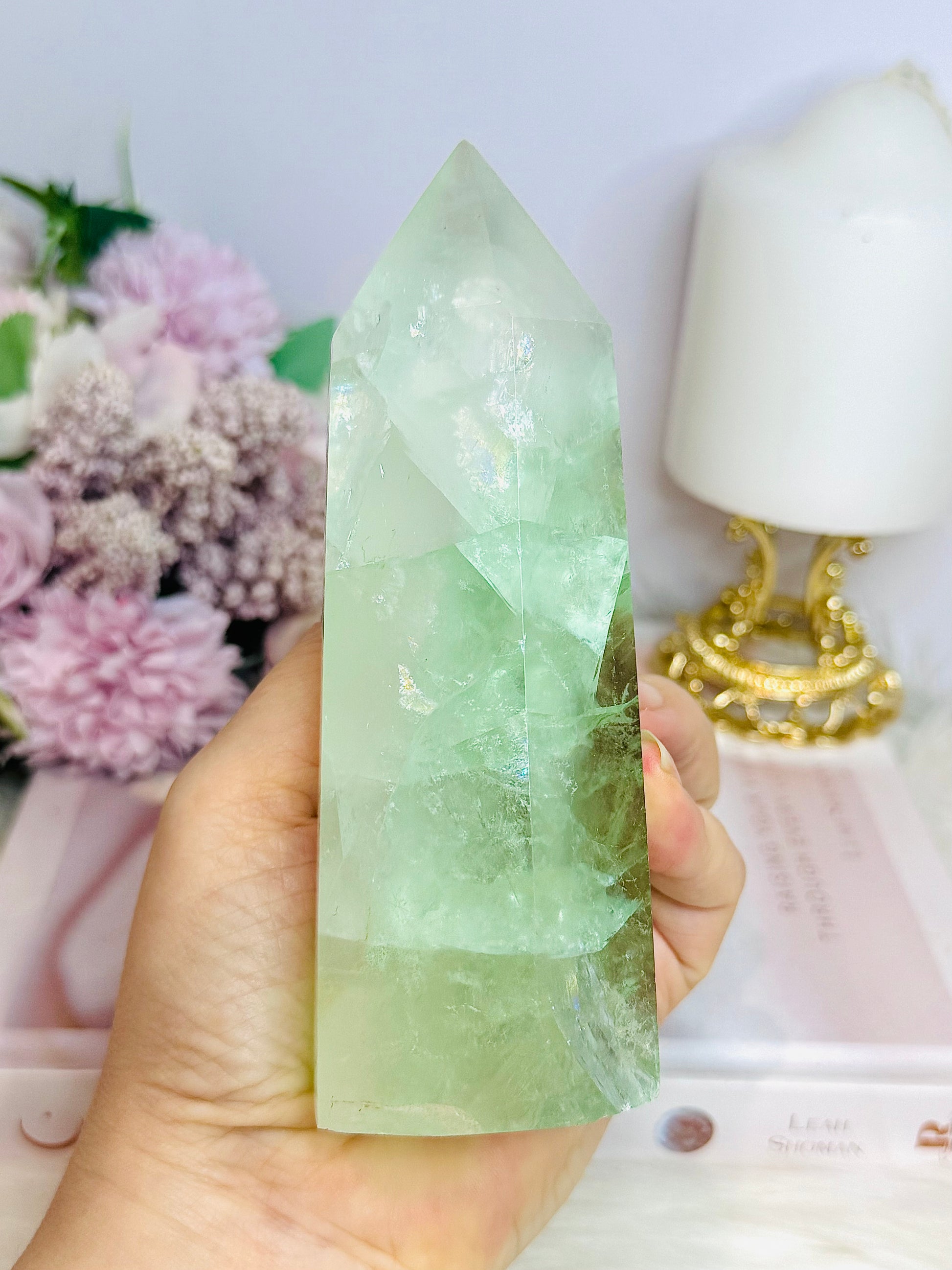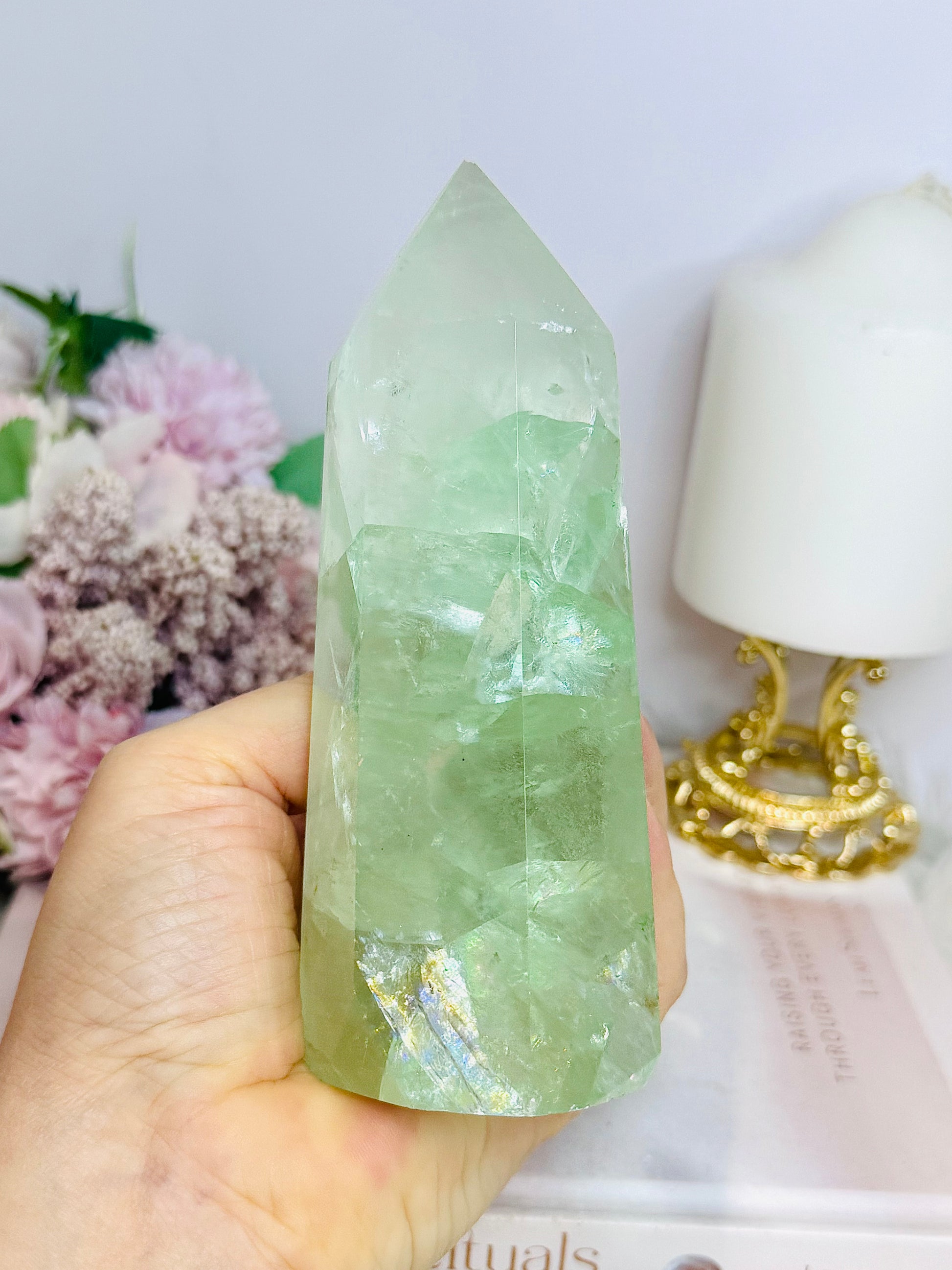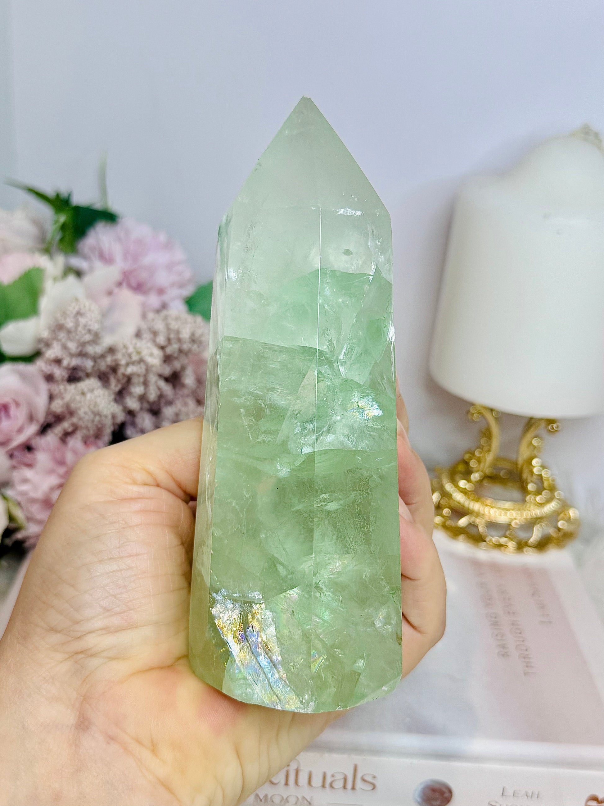 High Grade Light Green Fluorite Tower with Rainbows 14cm 551g