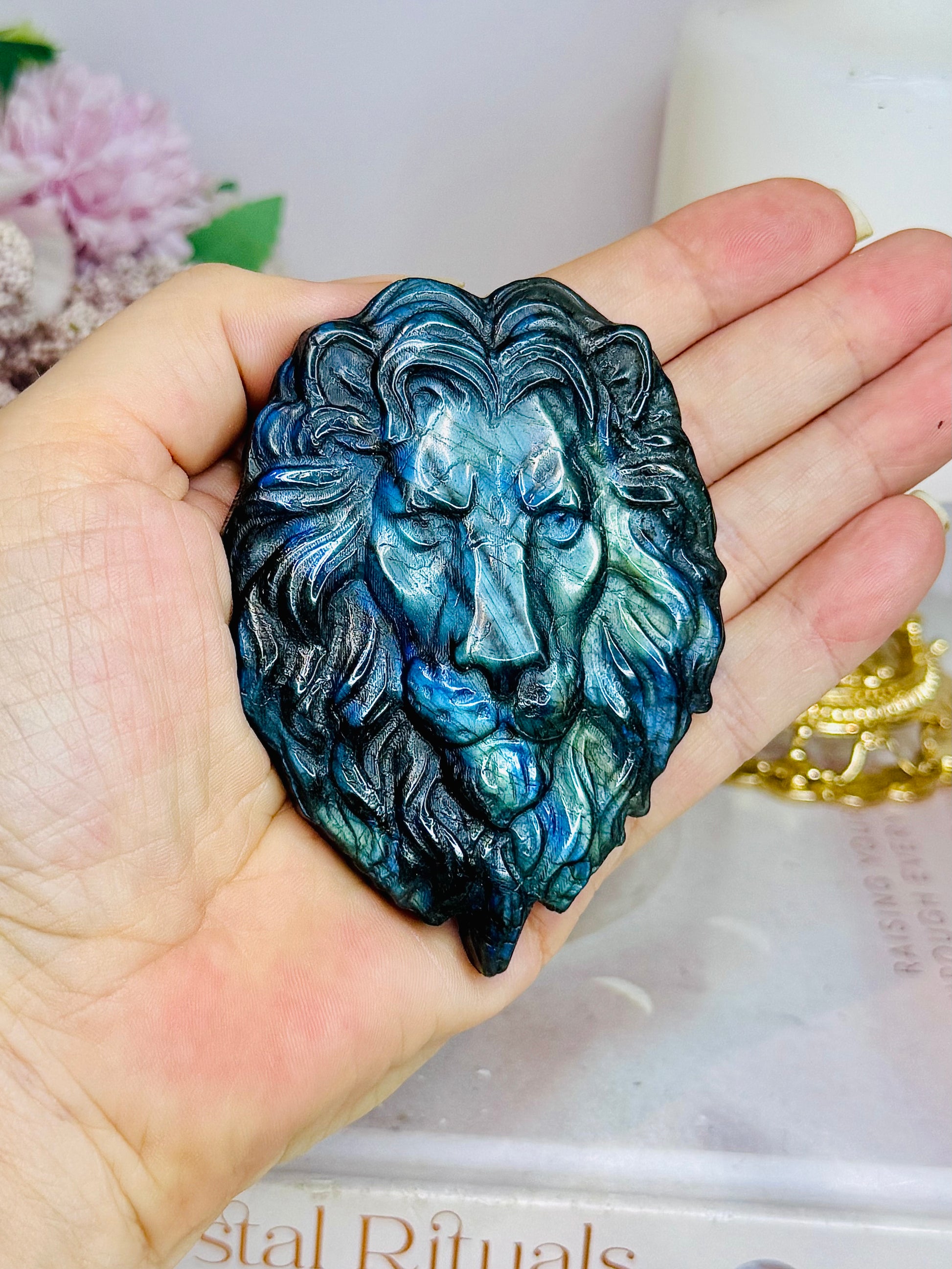 Labradorite Carved Lion Full of Blue Flash On Stand 8cm