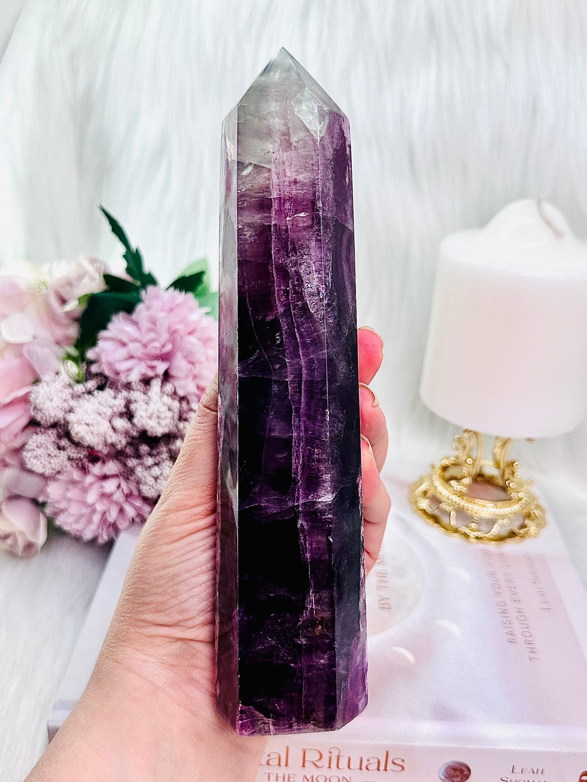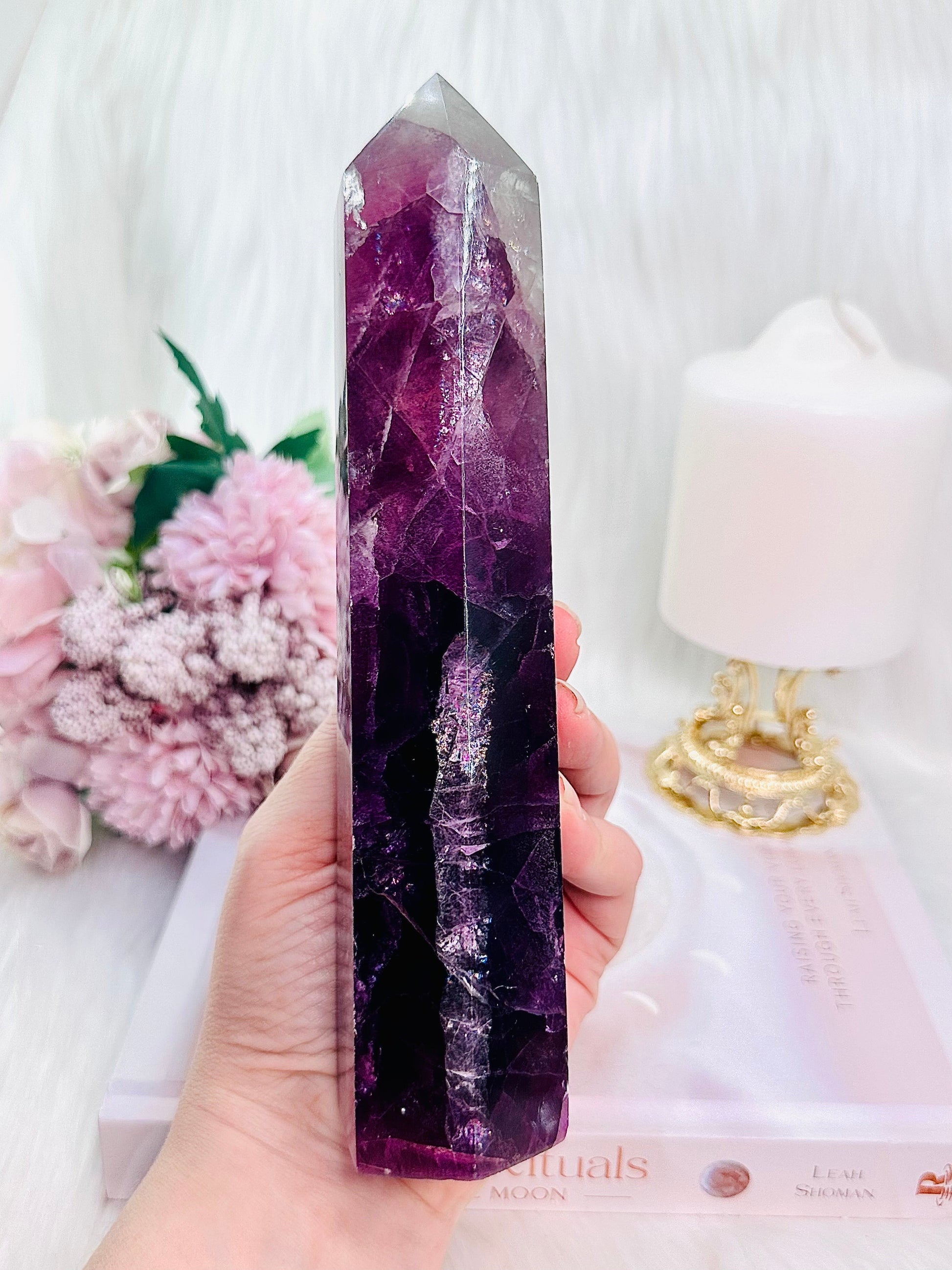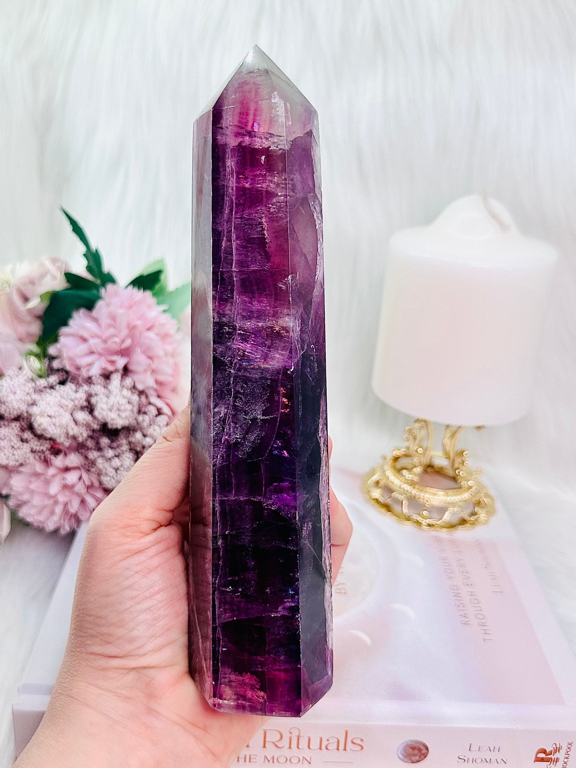 Large 20cm Stunning Purple Fluorite Tower with Rainbows (the tower has a slight tilt)
