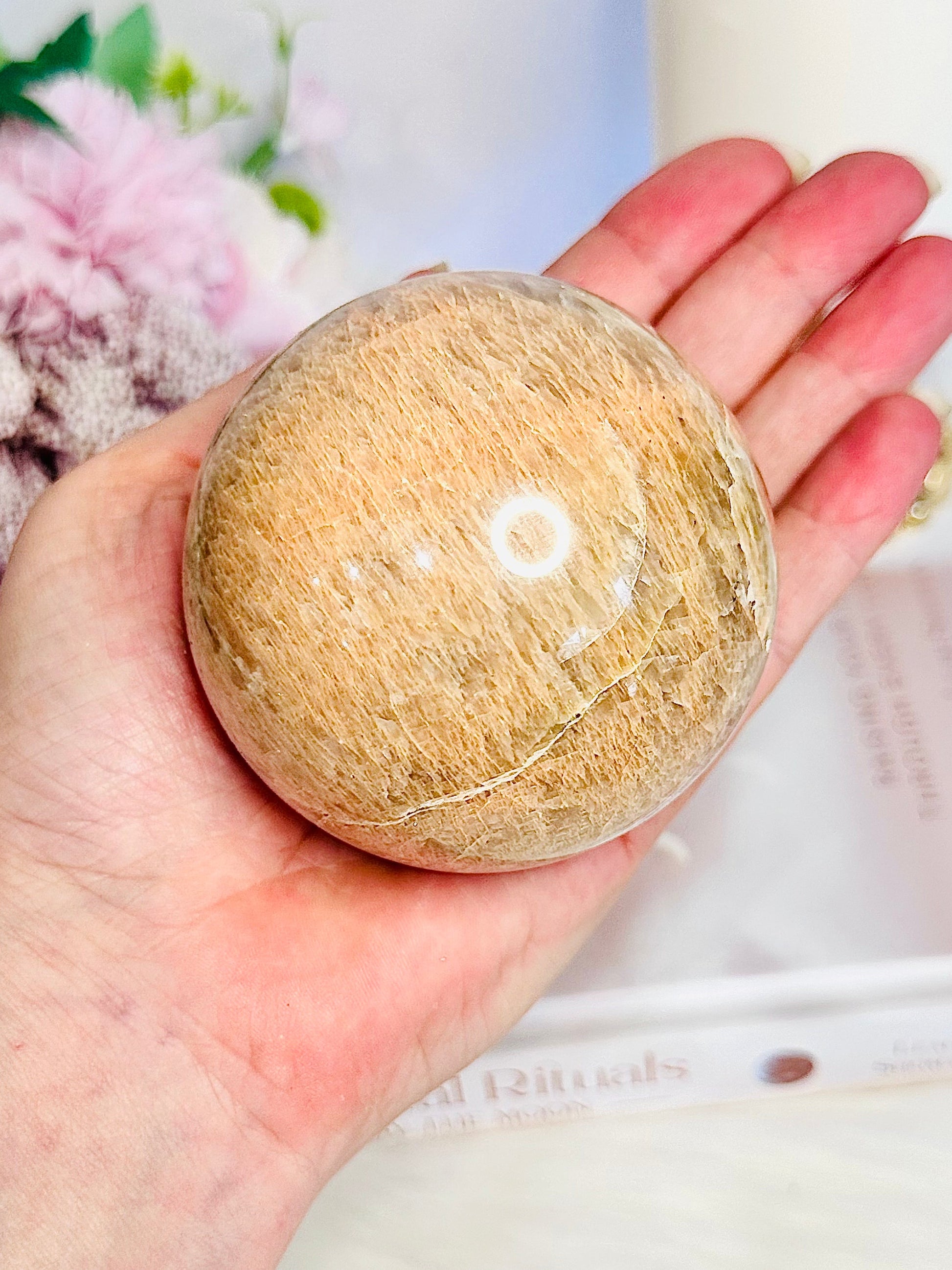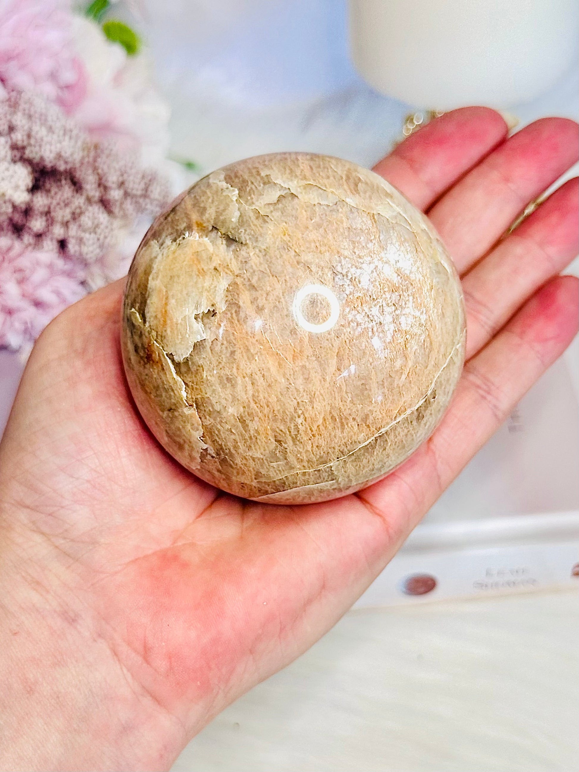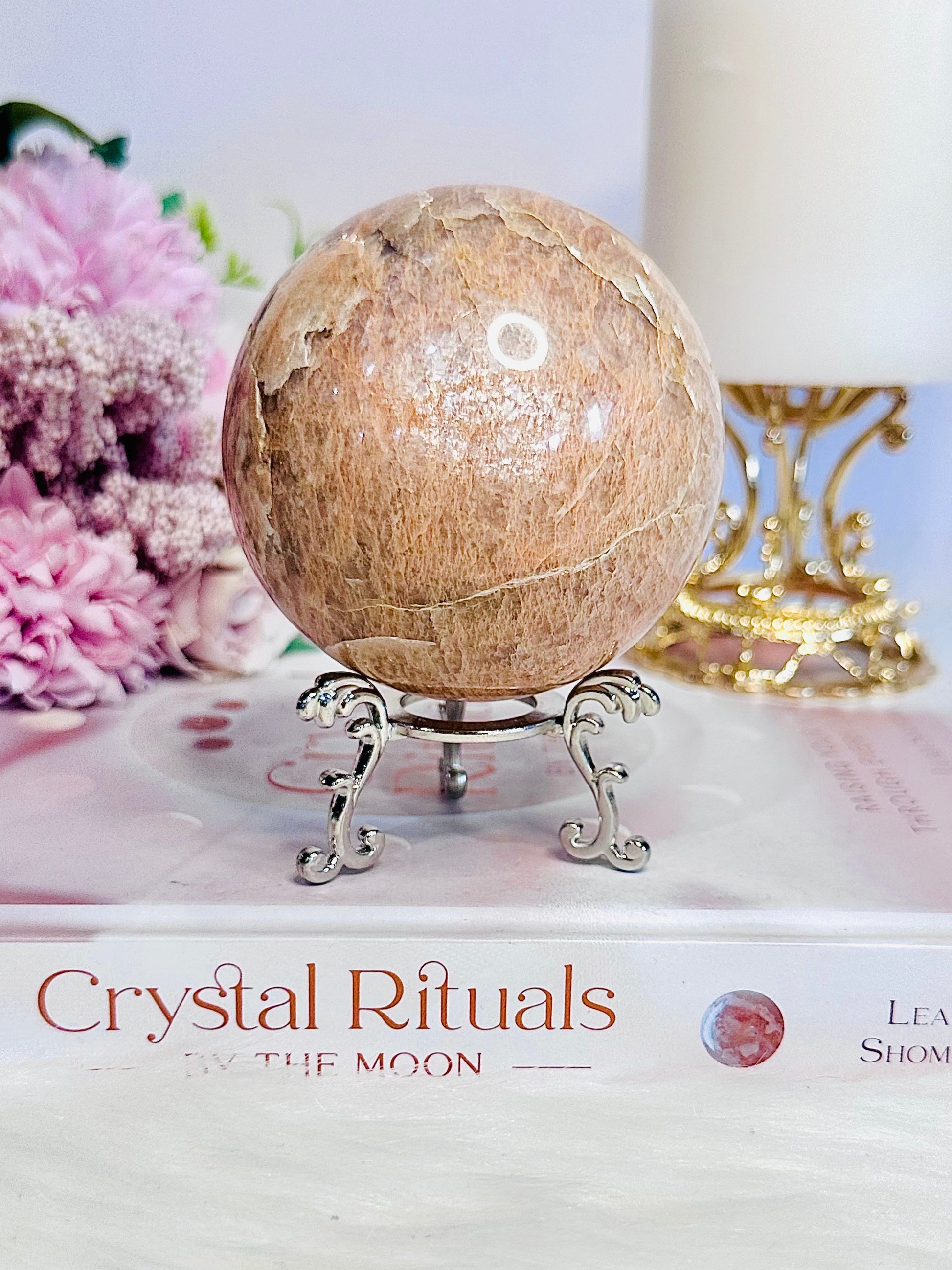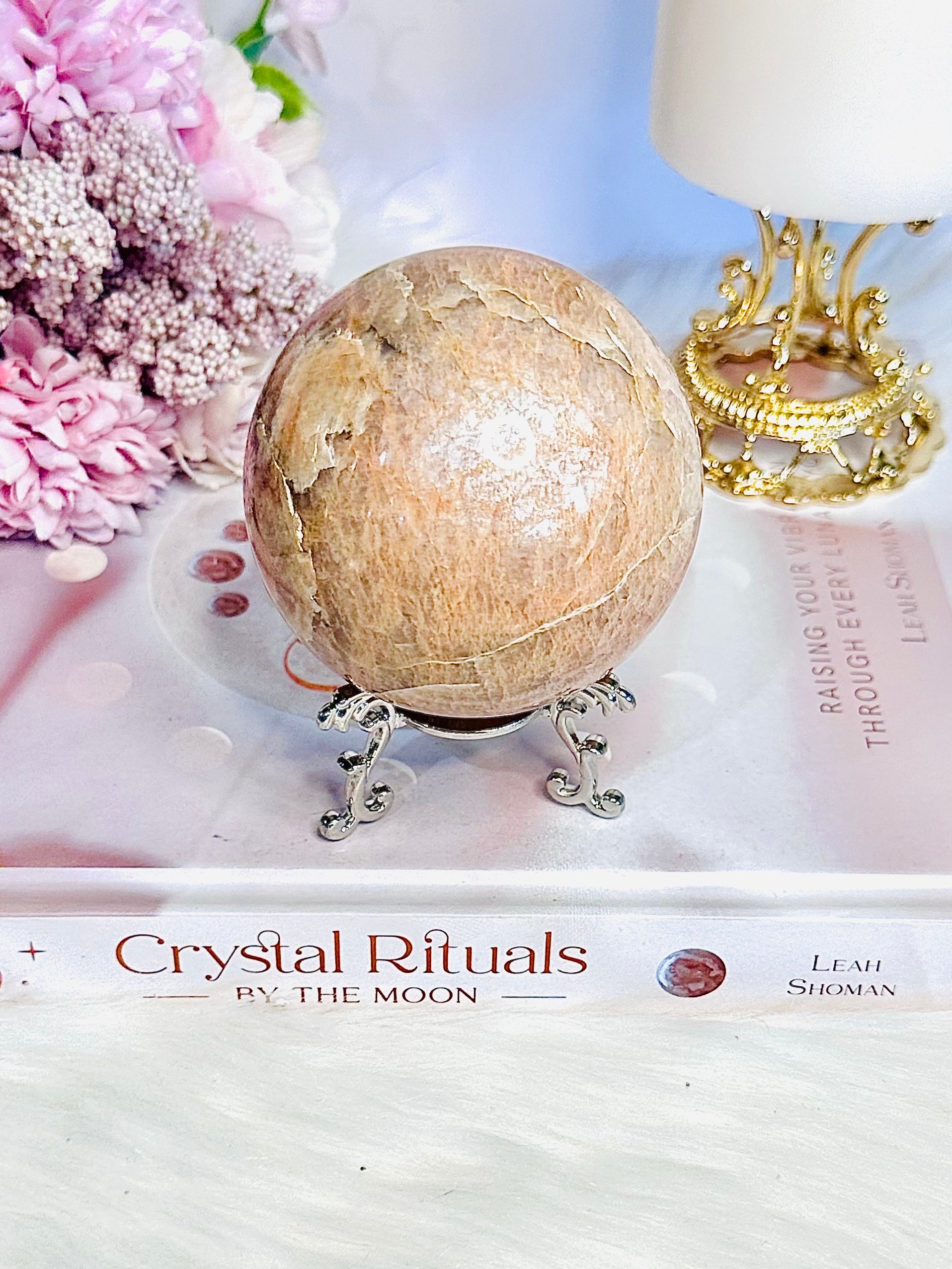 Large Peach Moonstone Sphere with Amazing Flash On Stand 478g