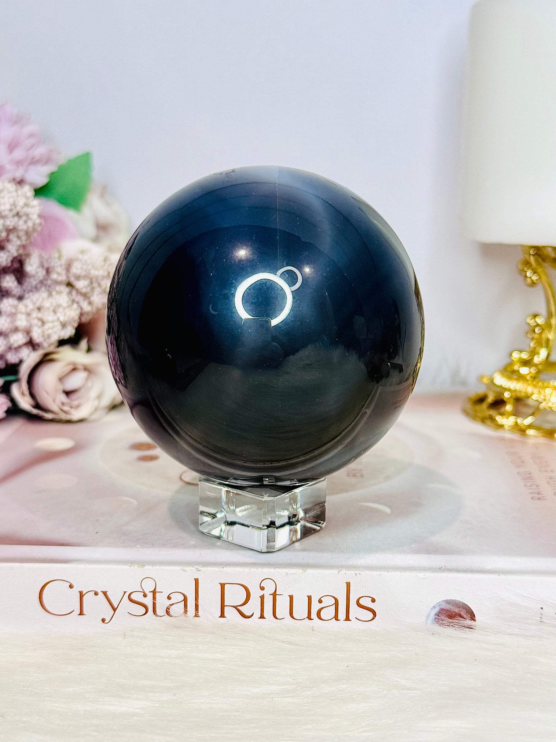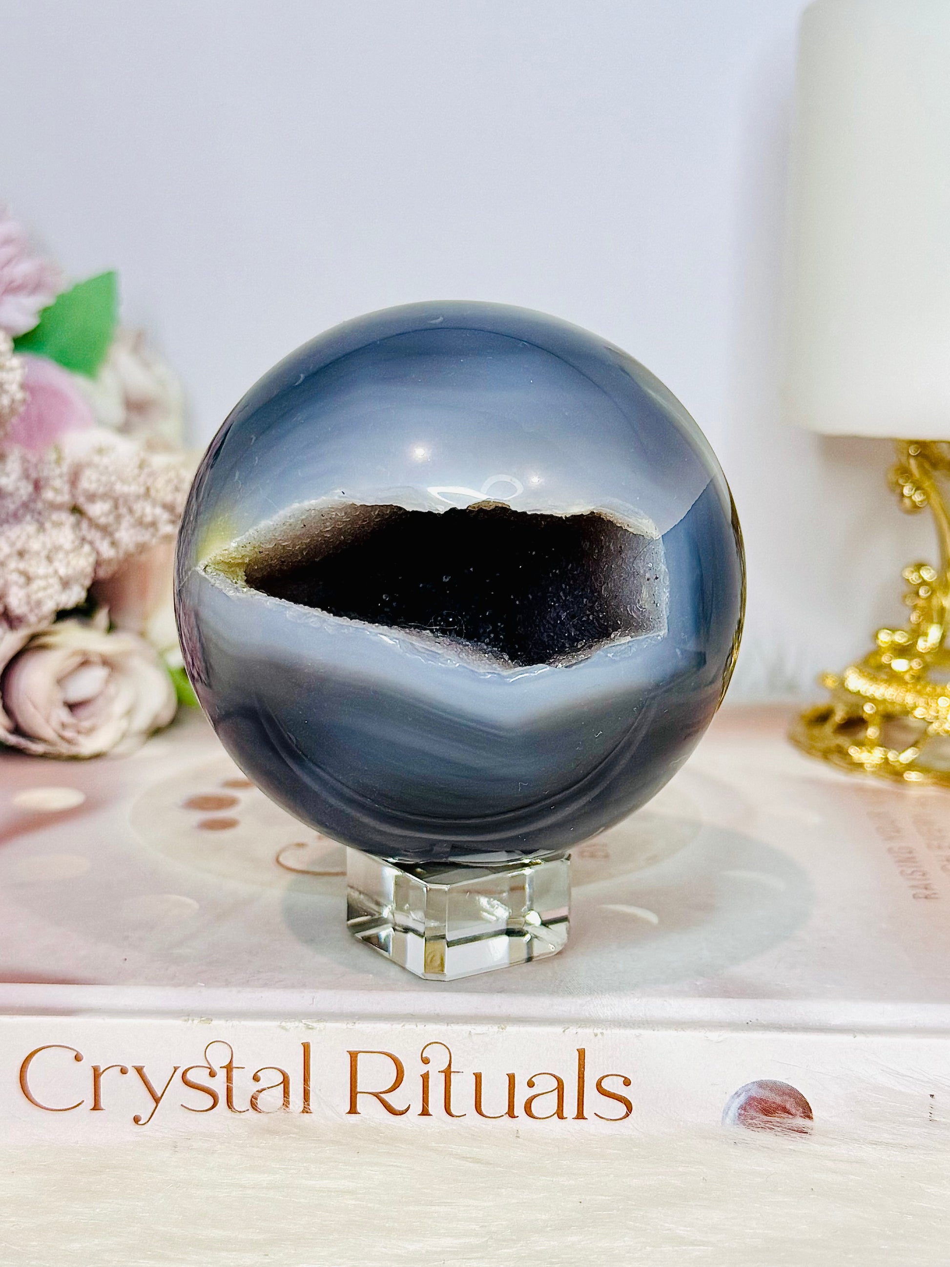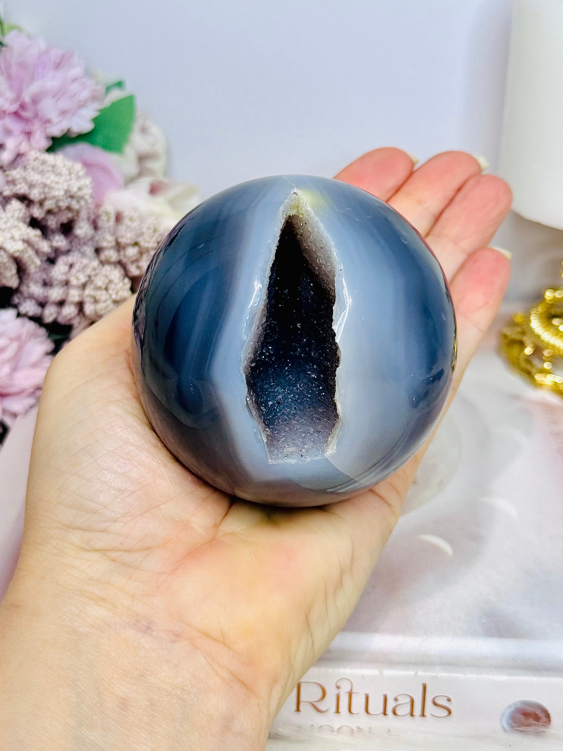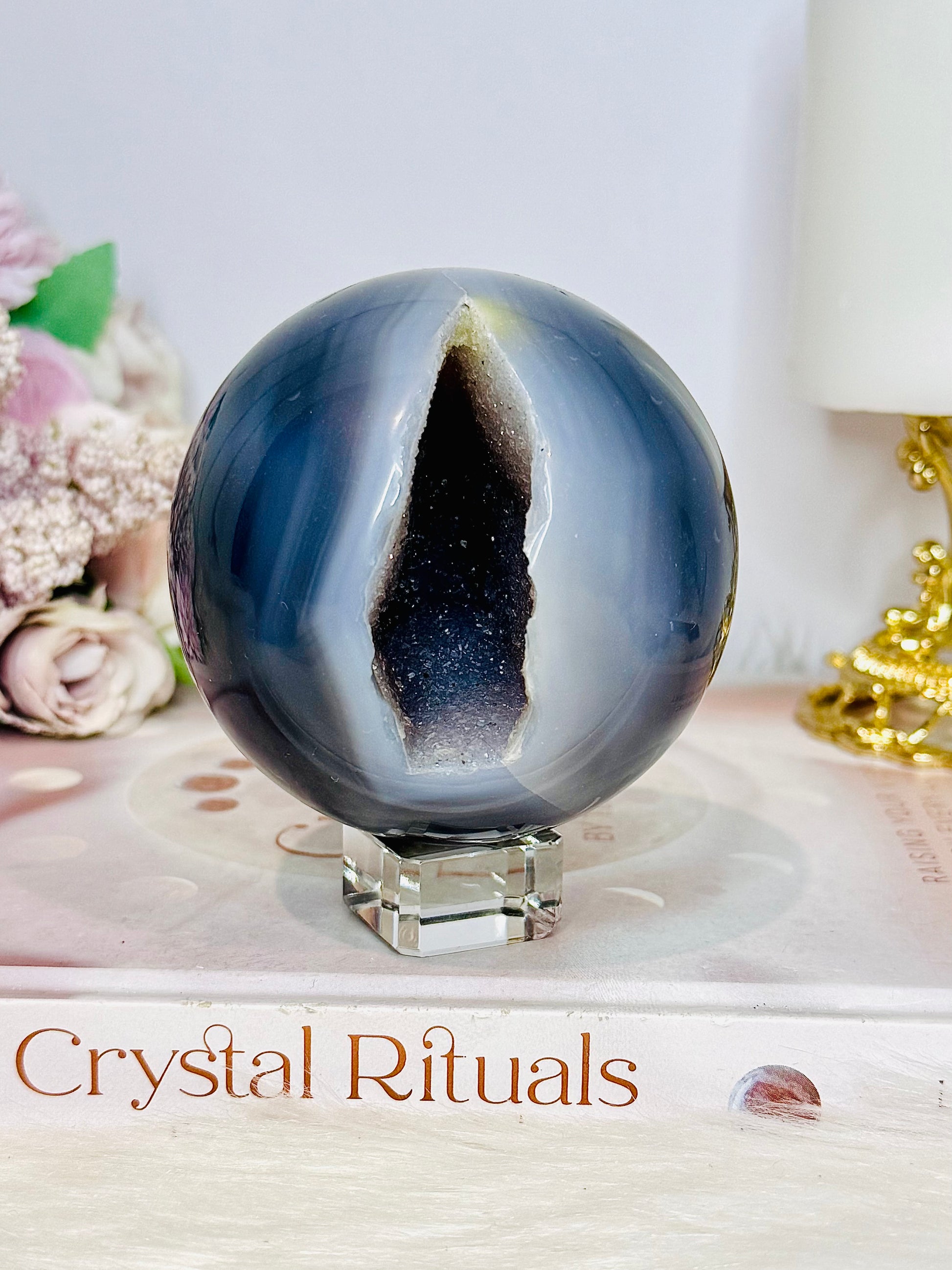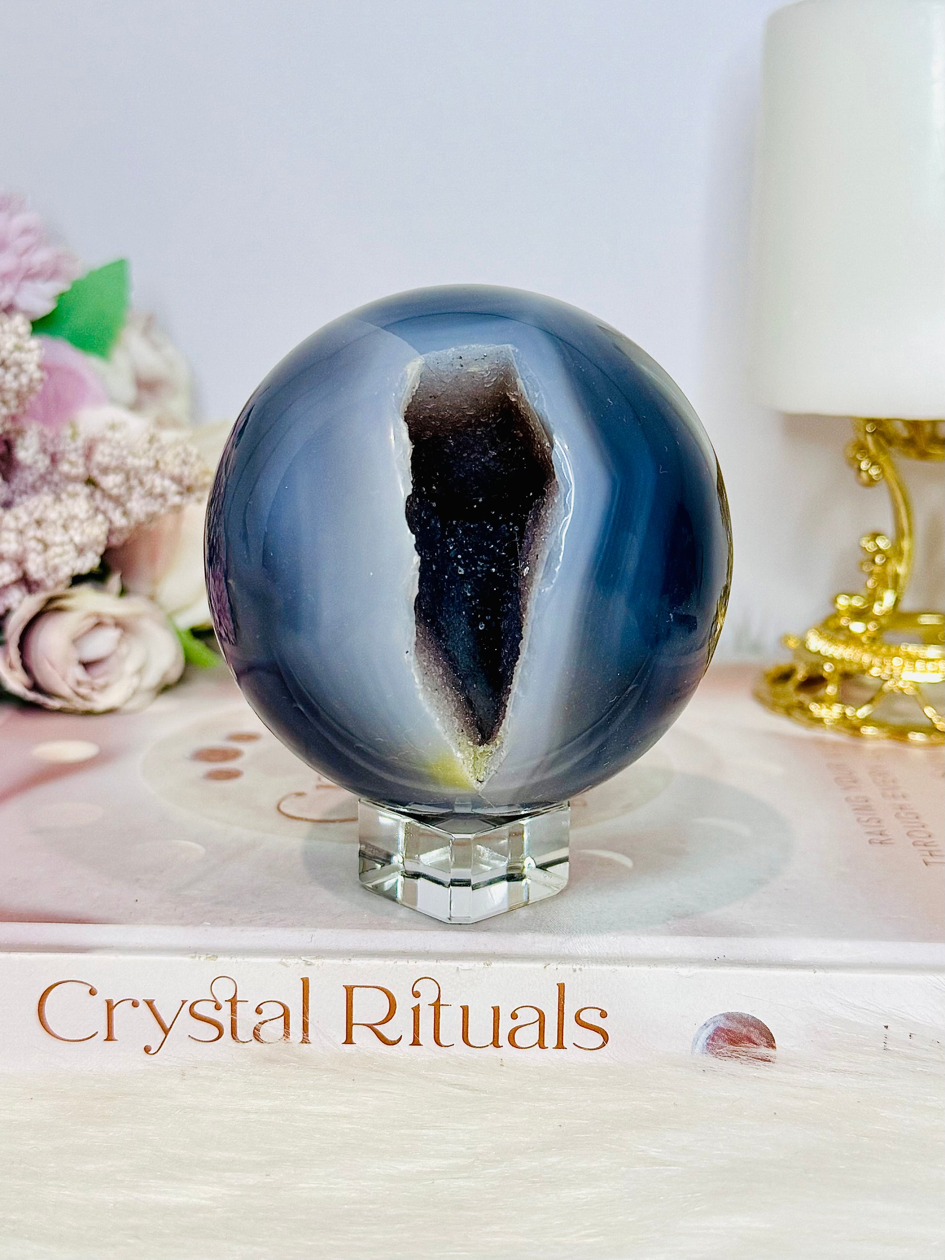 Large 536gram Blue Druzy Agate Sphere on Stand From Brazil