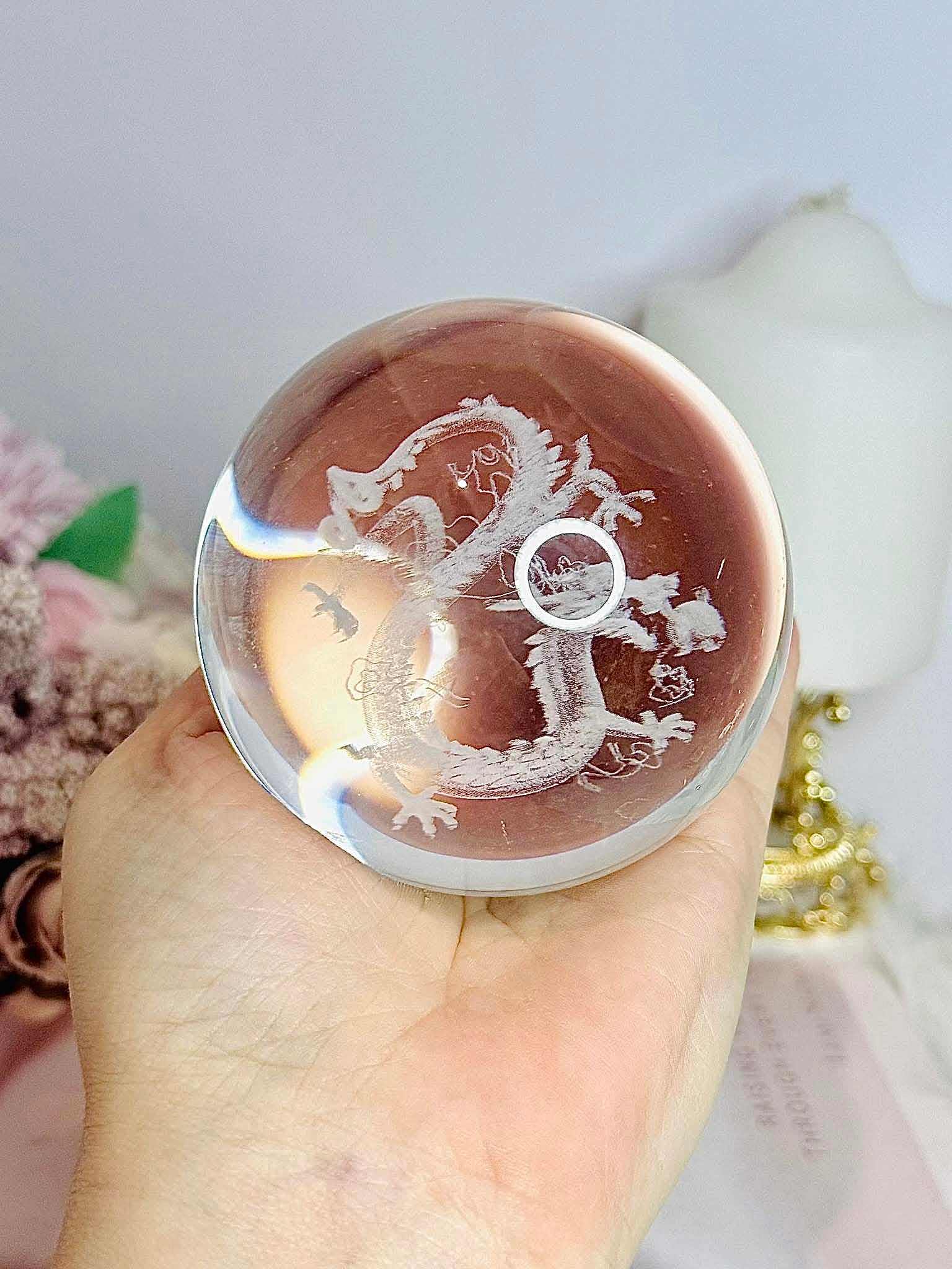 Large 602g Glass Chinese Dragon Sphere on Stand