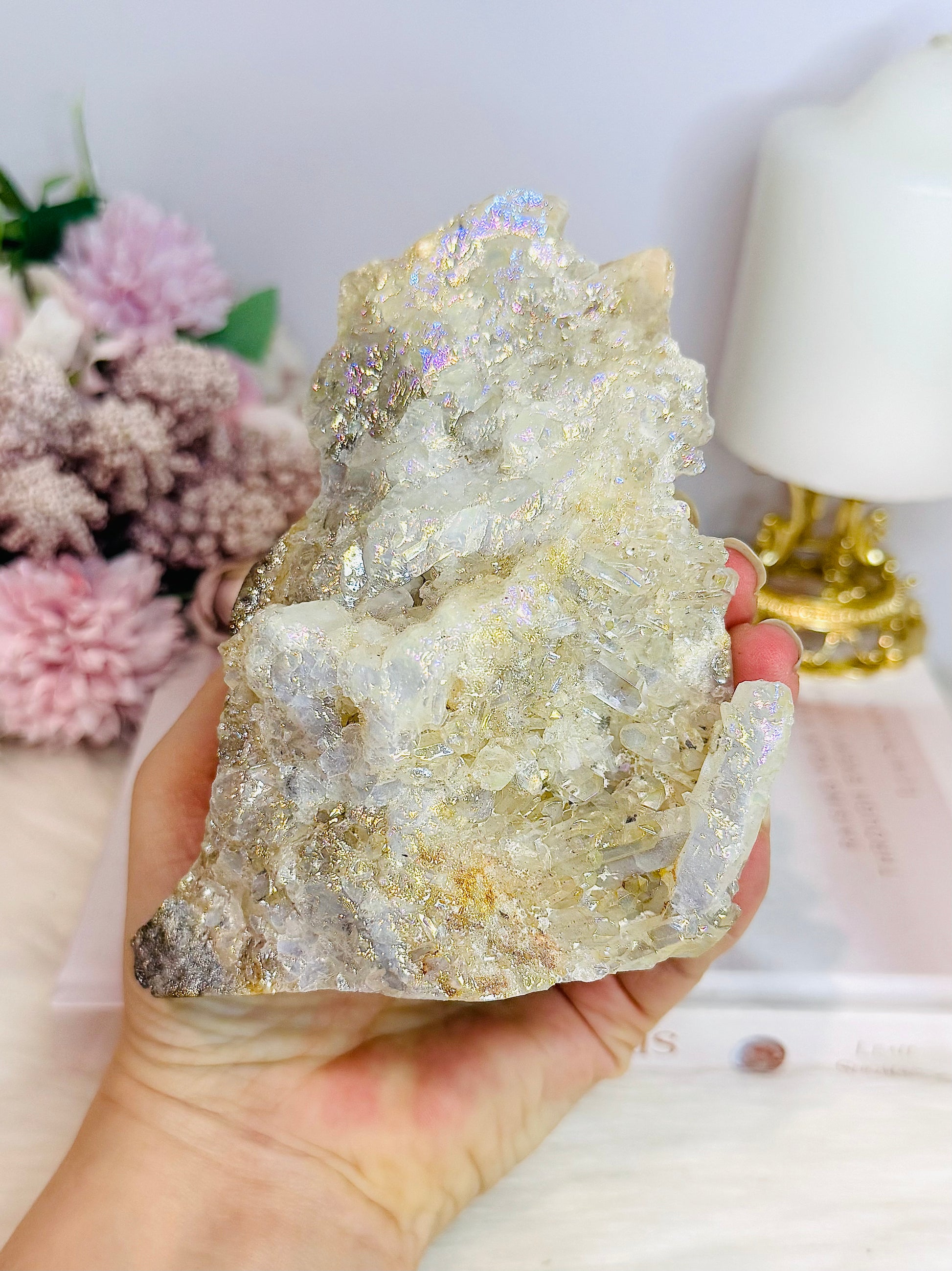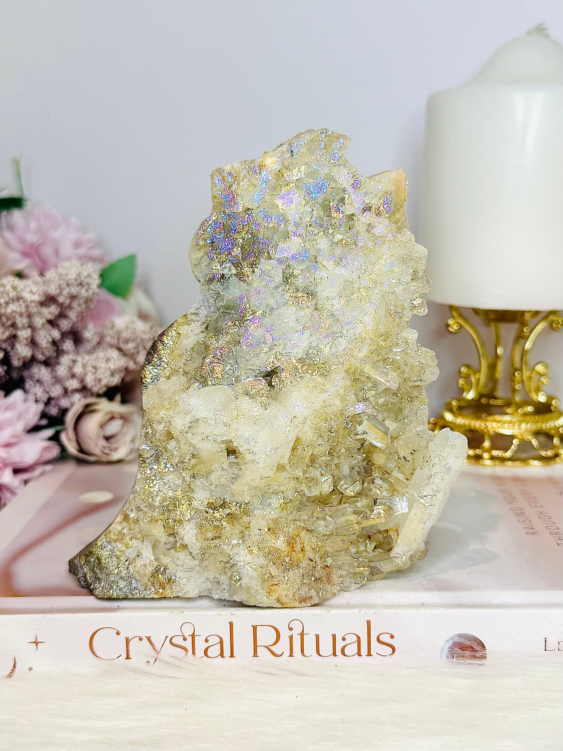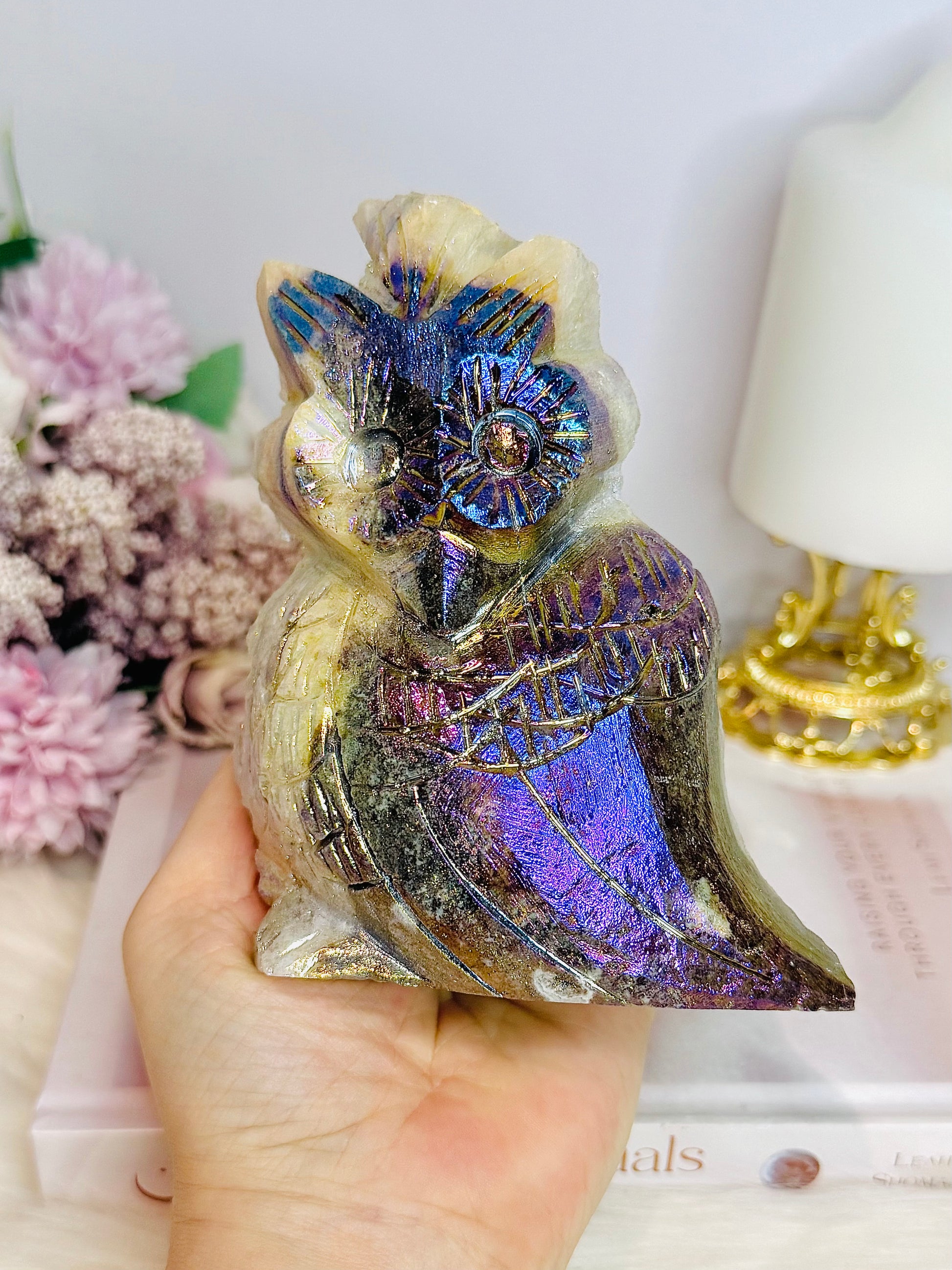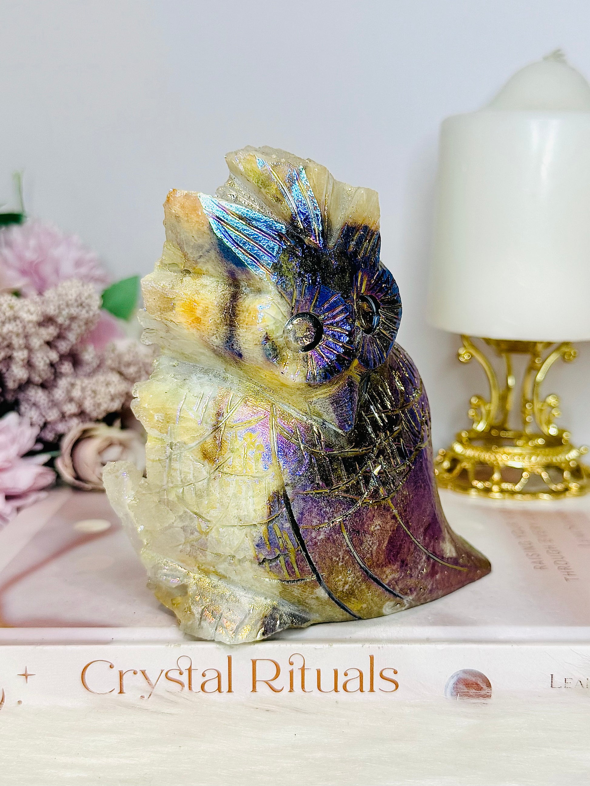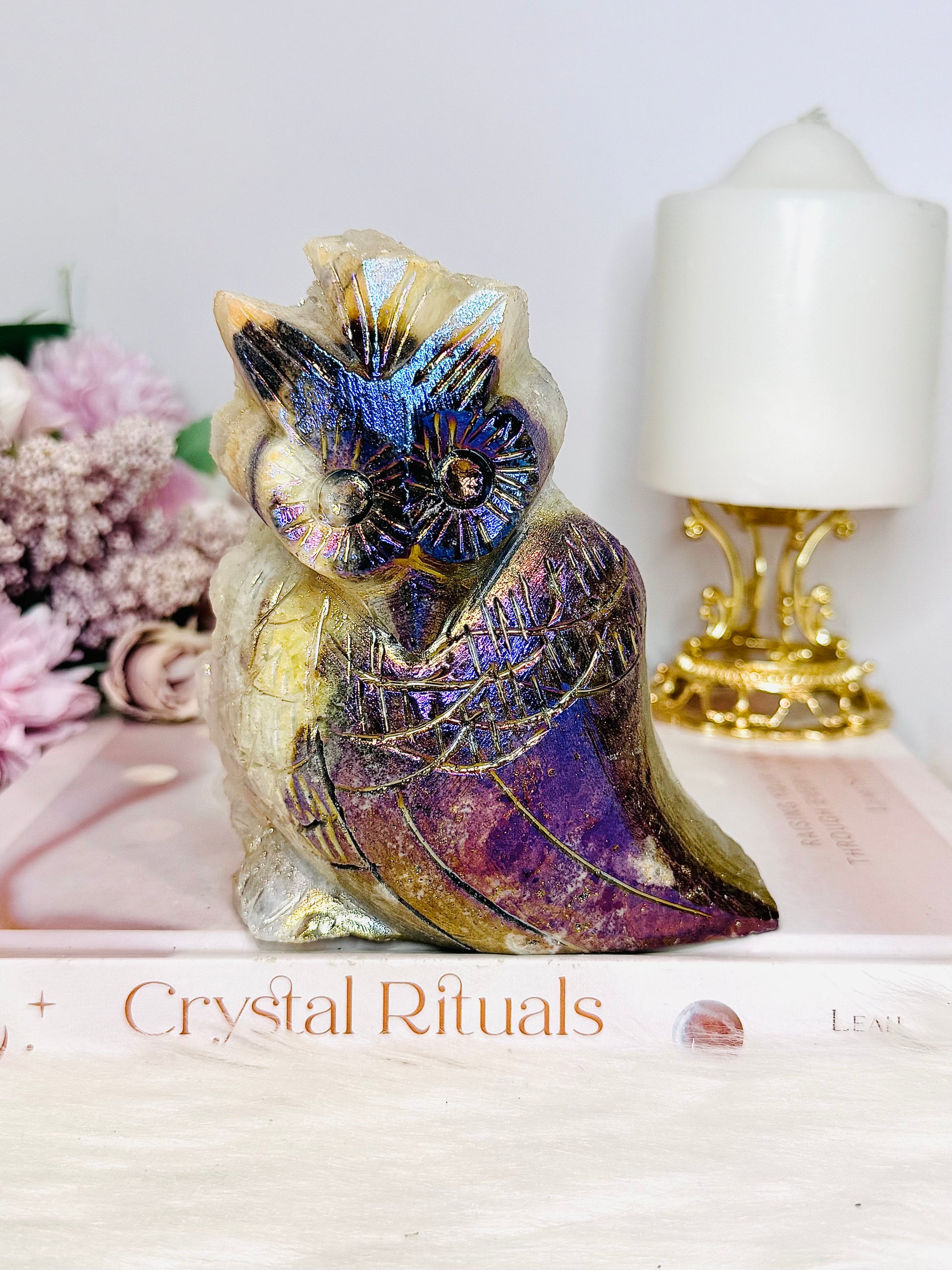 Large 683gram Aura Quartz Owl ~ See Back For Amazing Cluster Detail