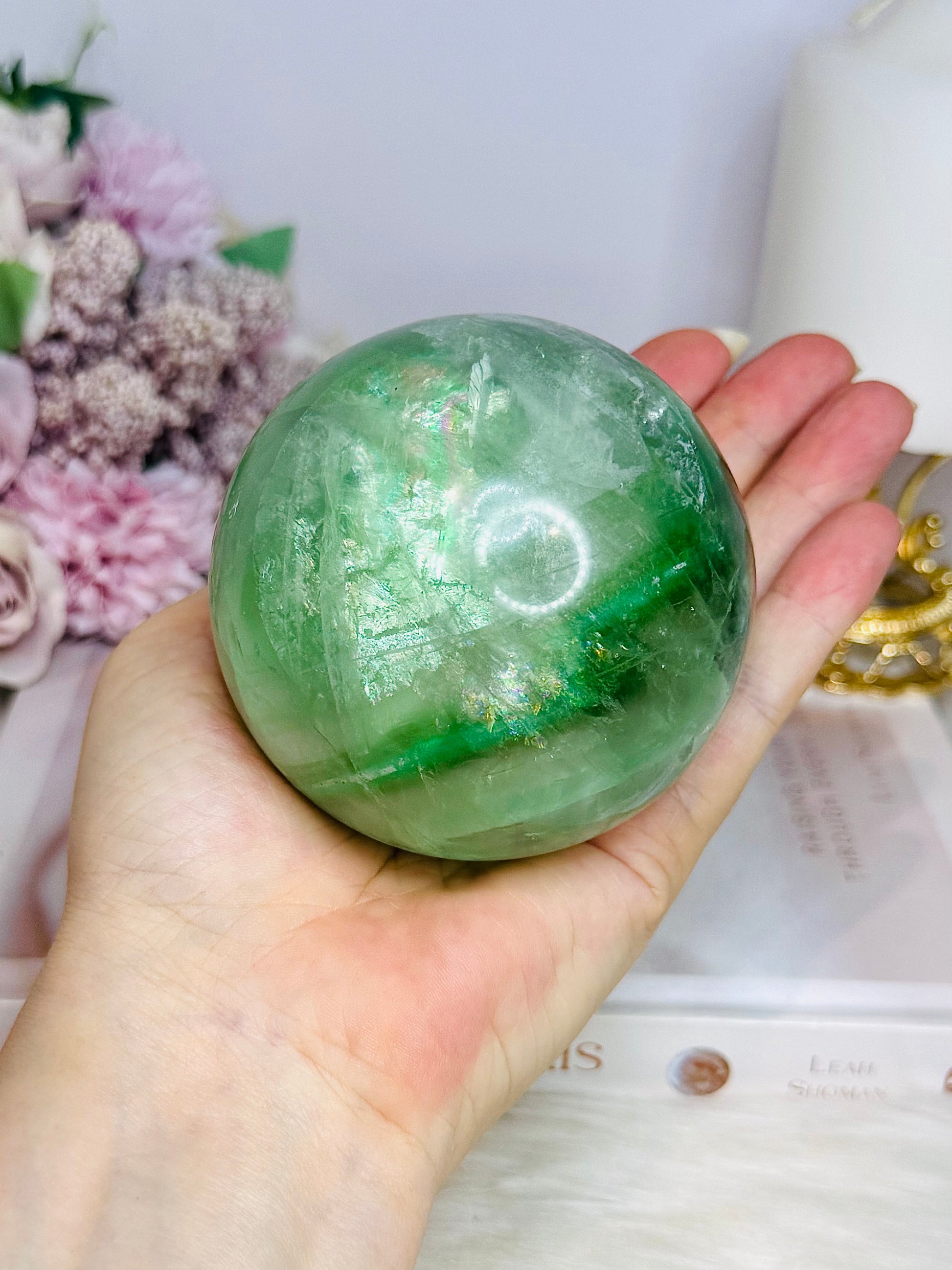 Large Green Fluorite Sphere Full of Rainbows 777g