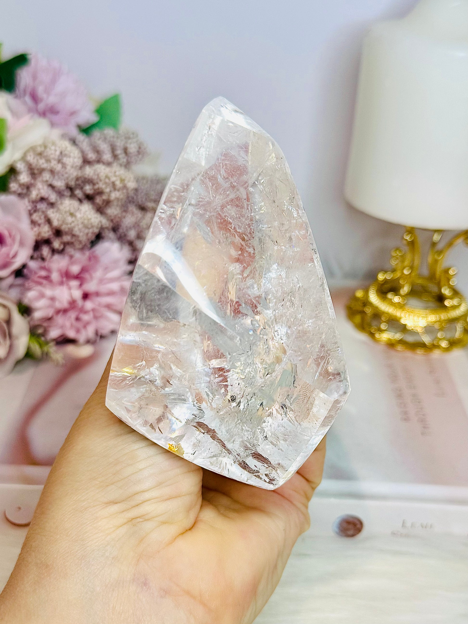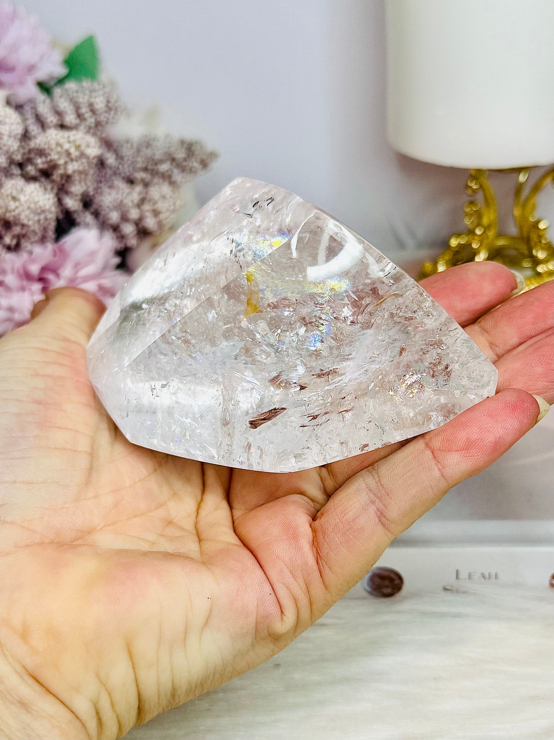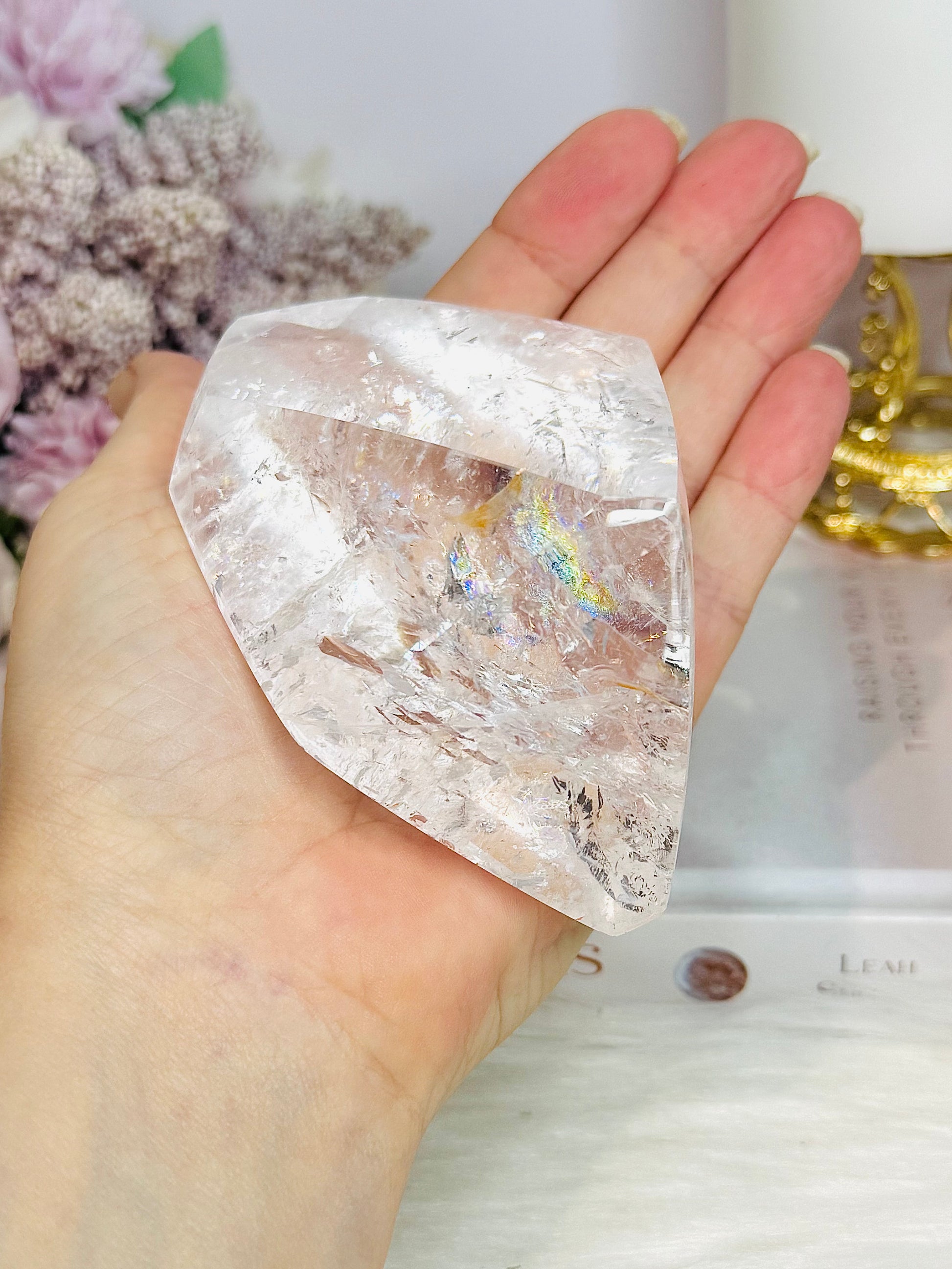 Large High Grade Clear Quartz Polished Freeform with Rainbows 346g
