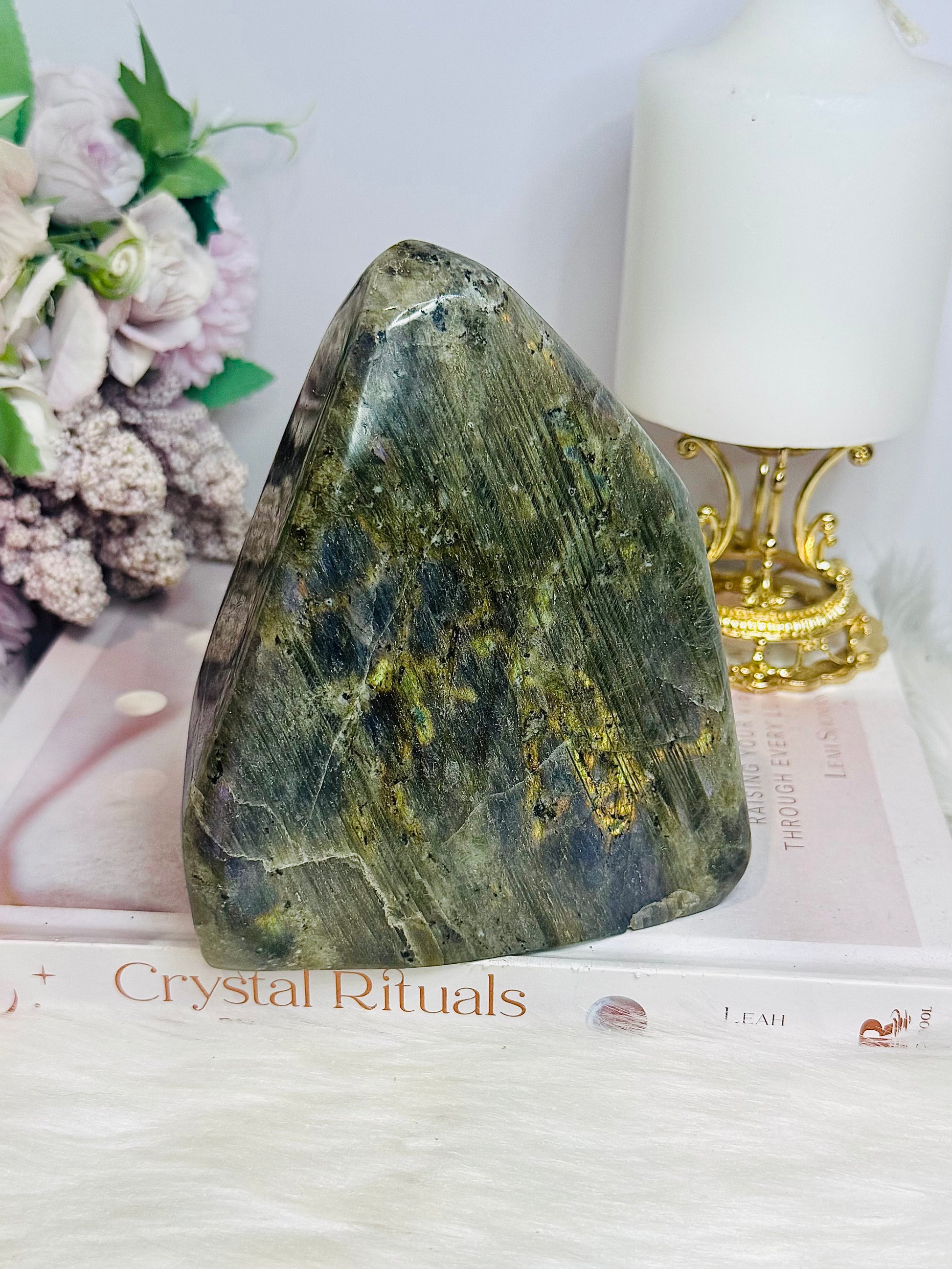 Manifestation ~ Labradorite crystal's hallmark is transformation and change. Viewed as a power stone, allowing one to see through illusions and determine the actual form of your dreams and goals. It is used in magic for manifestation, scrying, and protection - largely associated with the divine feminine.