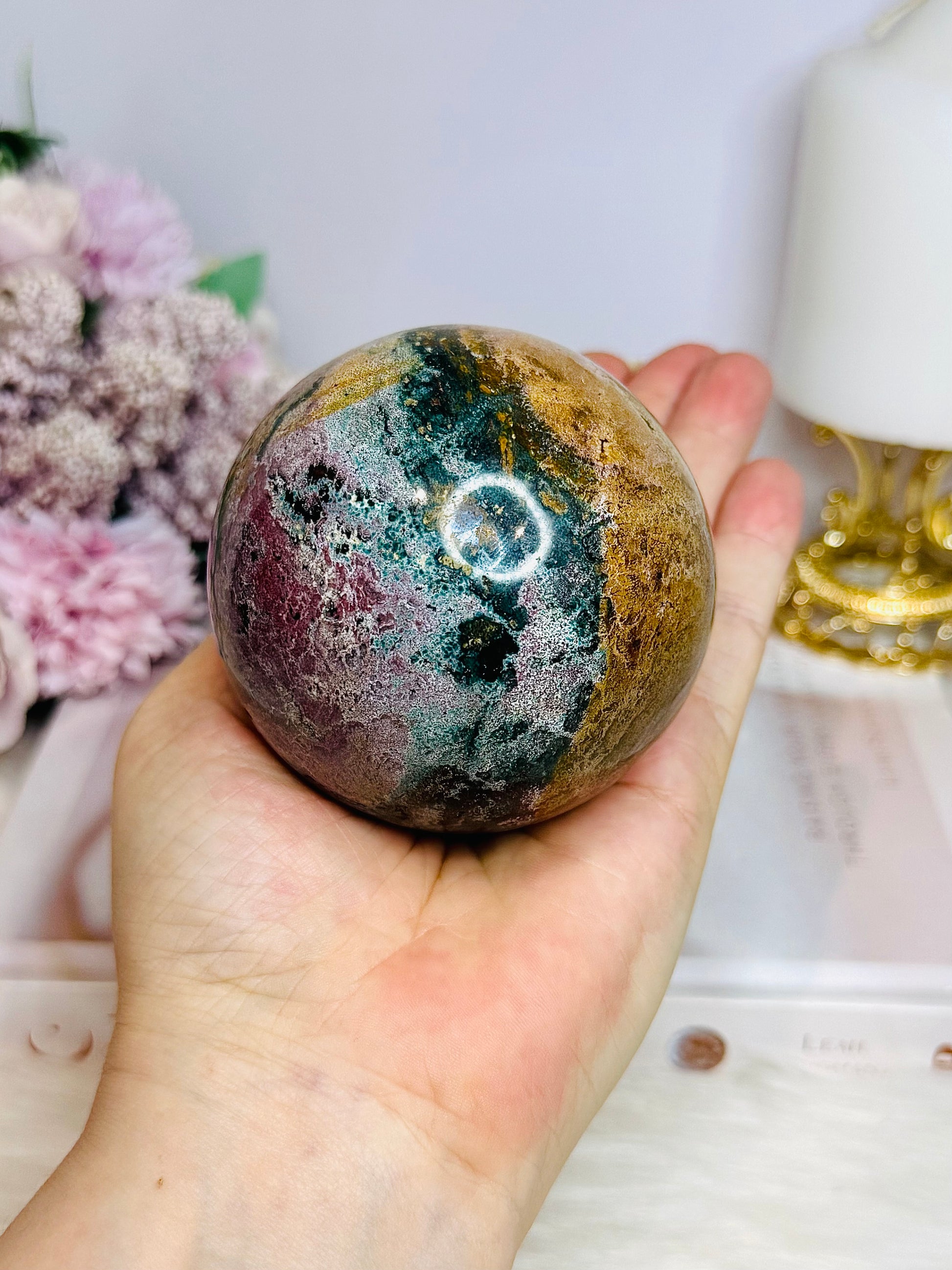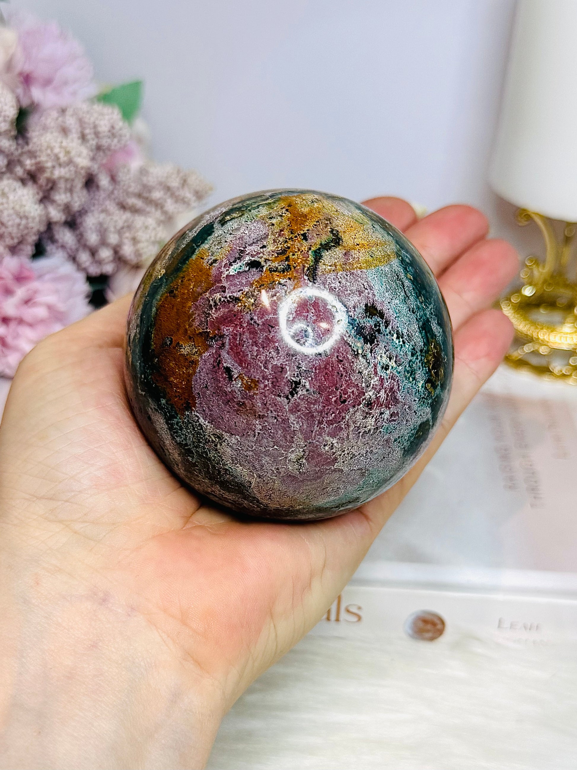 Large Ocean Jasper Sphere On Stand 516g