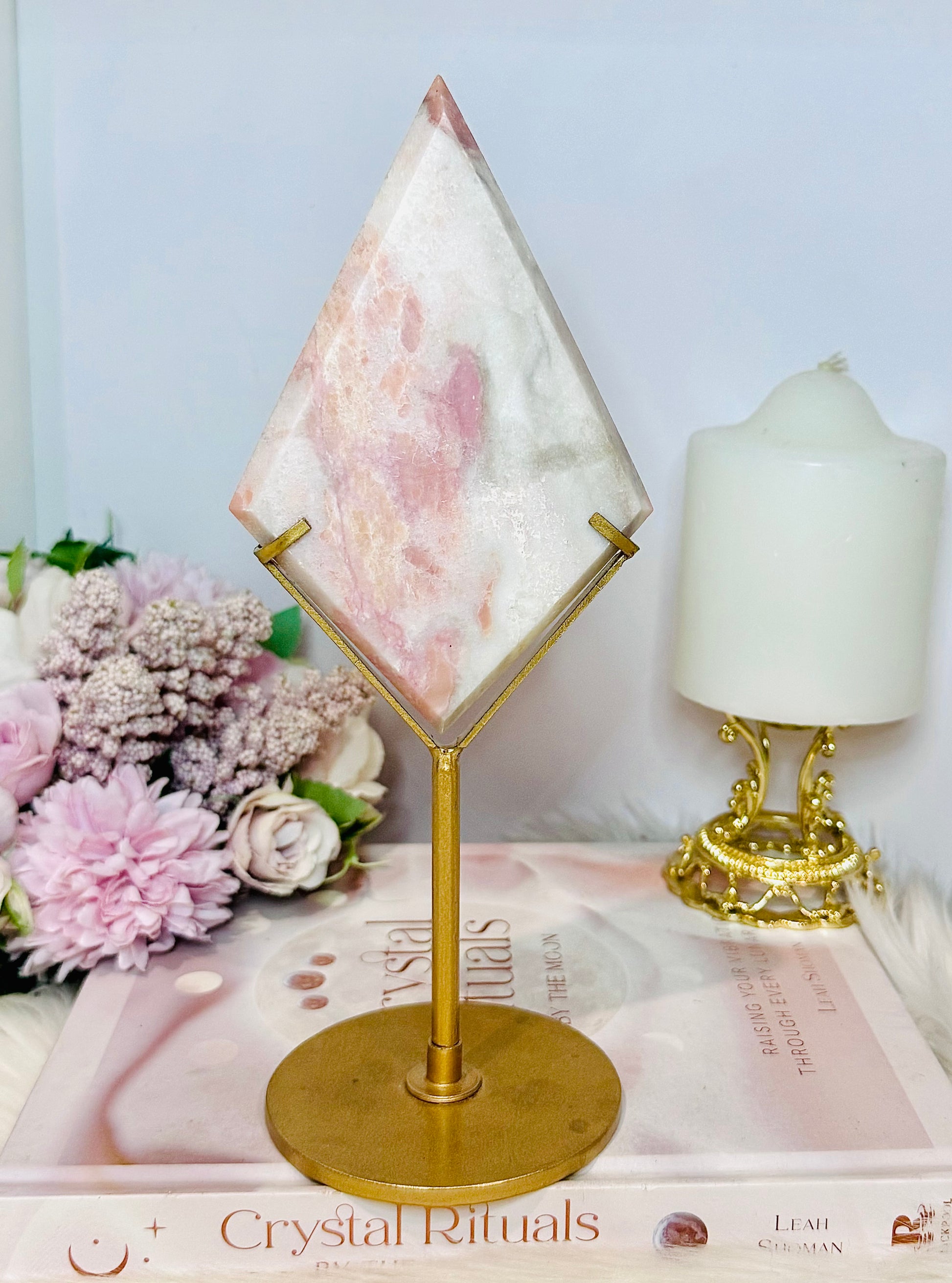 Large Pink Opal Diamond On Gold Stand 22.5cm