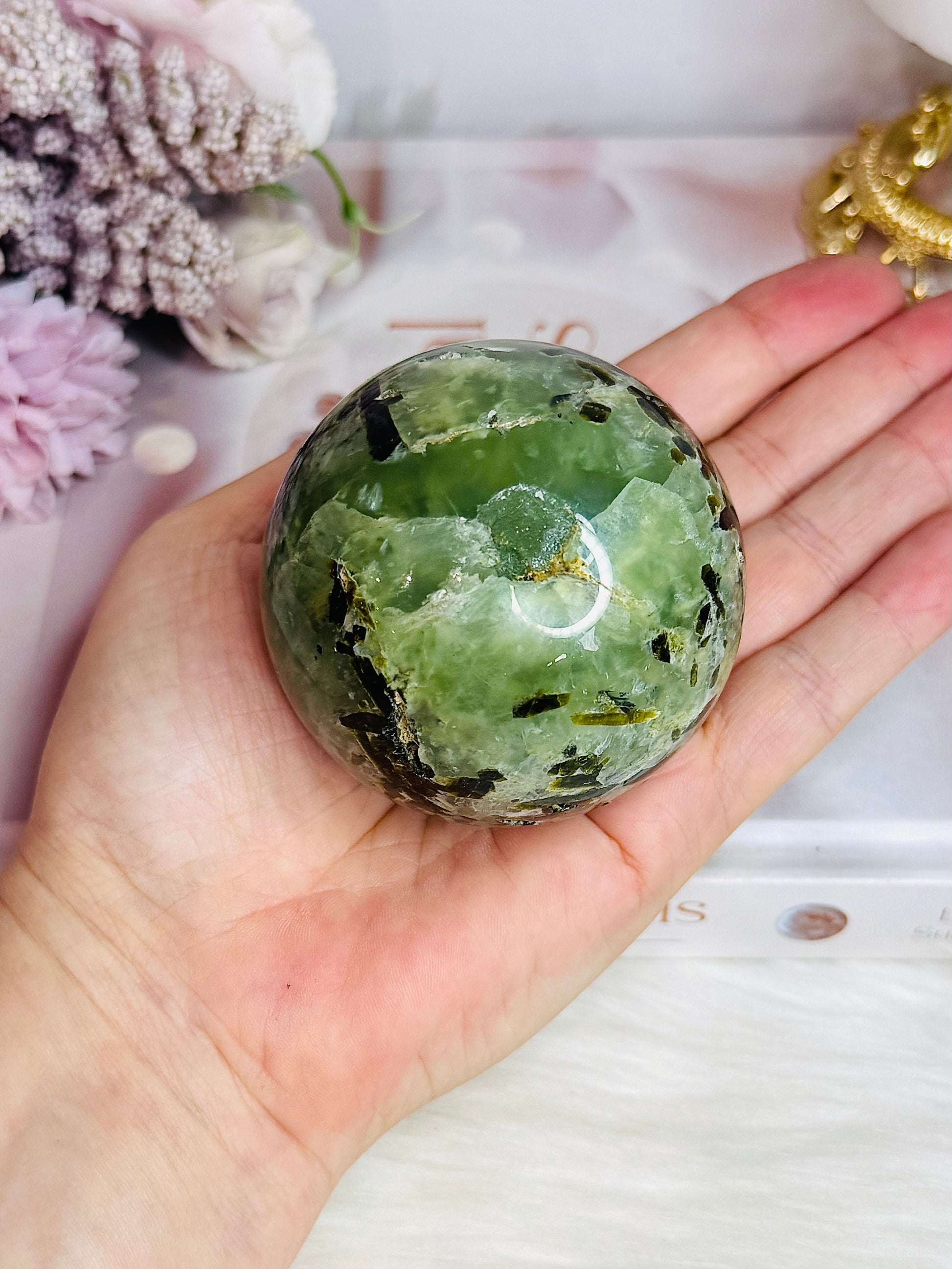 Large Prehnite with Epidote Sphere on Stand 412g (Sphere has an imperfection)