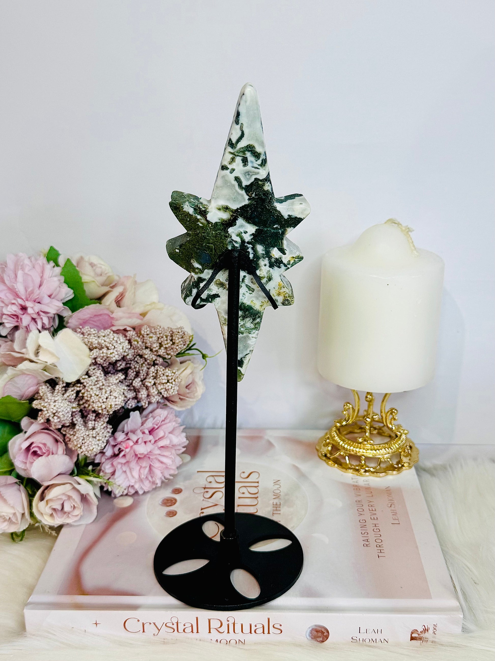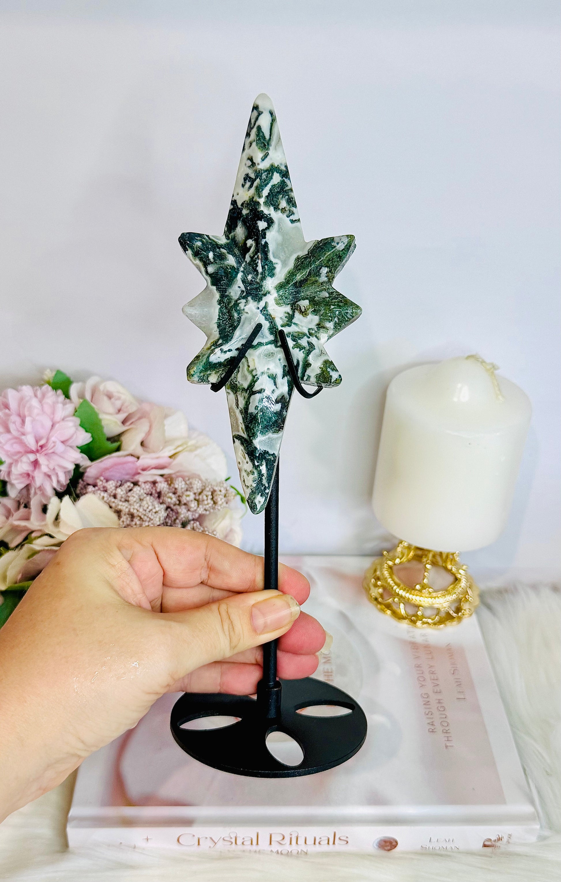 Moss Agate Carved Polaris Star On Stand 24.5cm