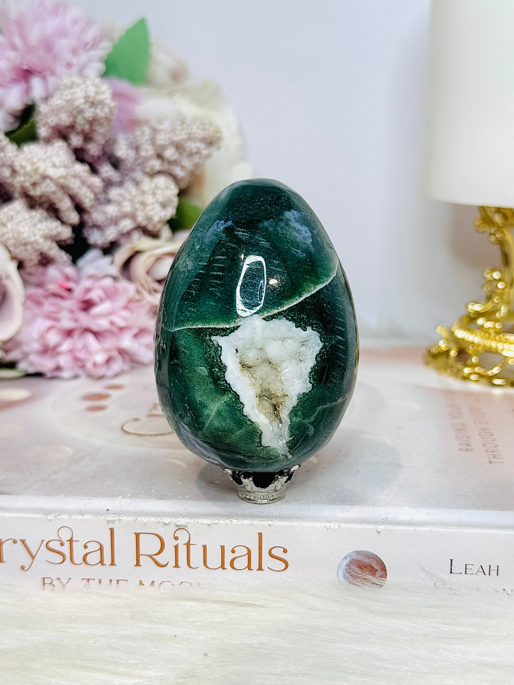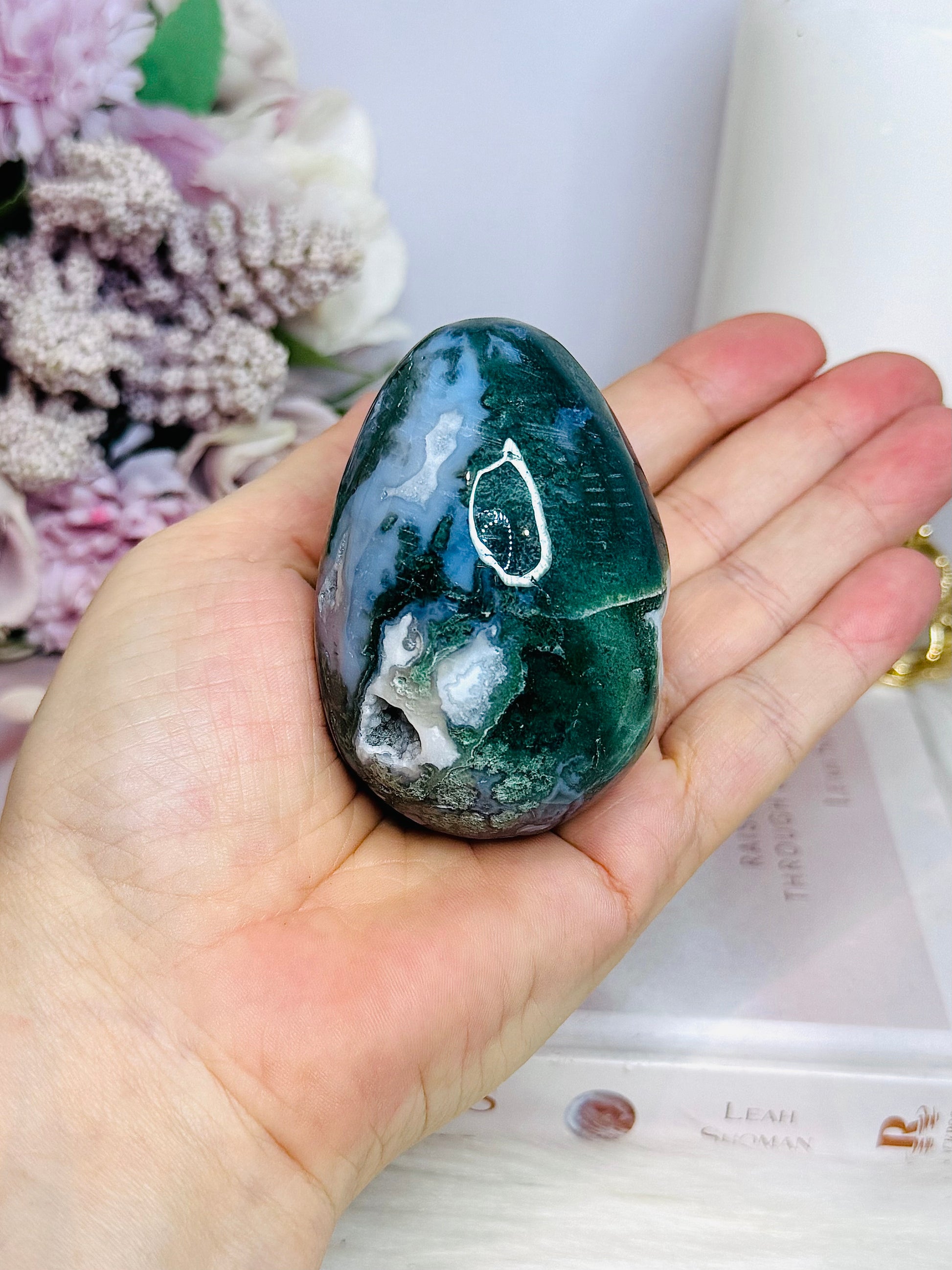 Moss Agate Druzy Carved Egg On Stand 7cm