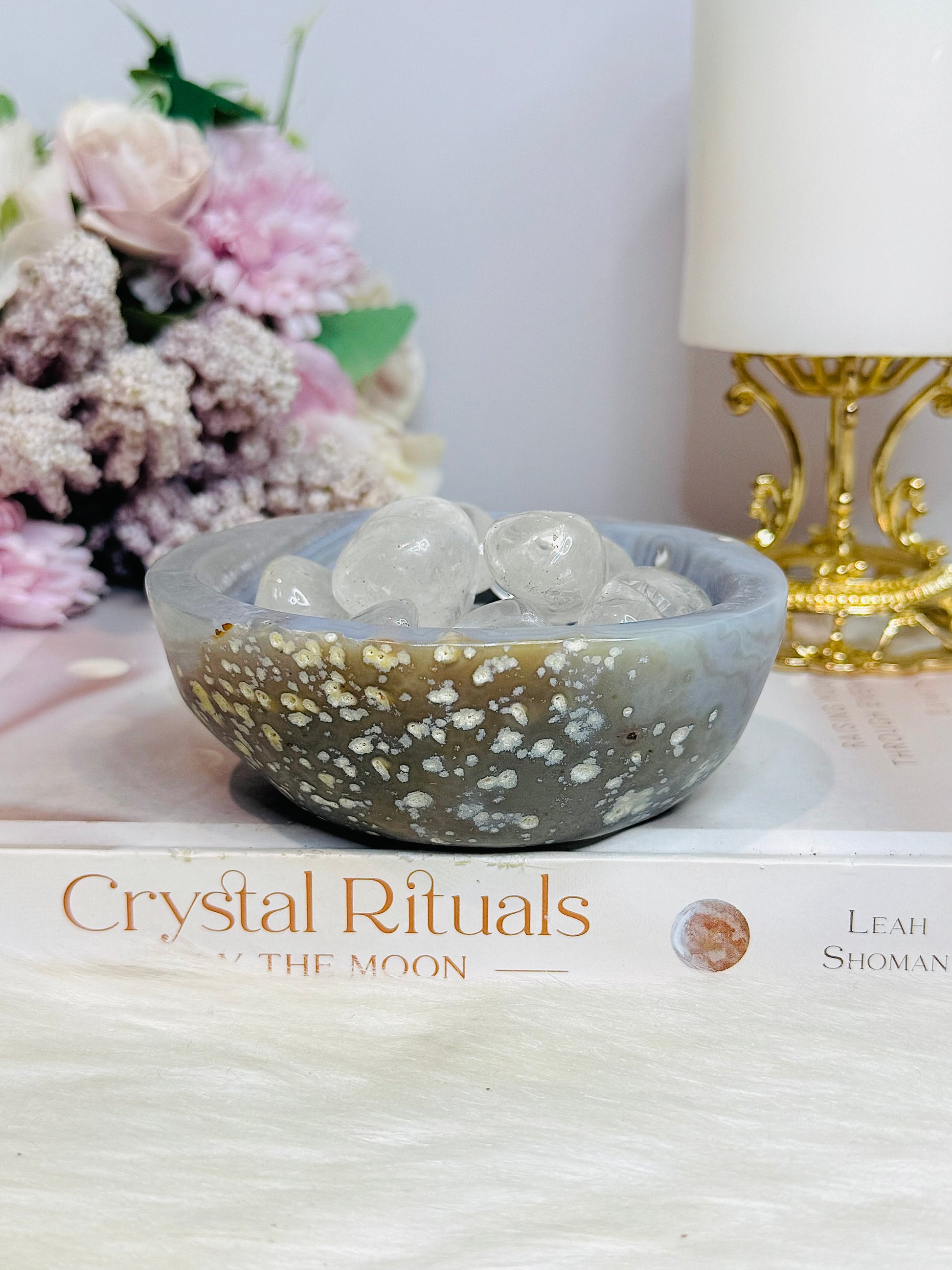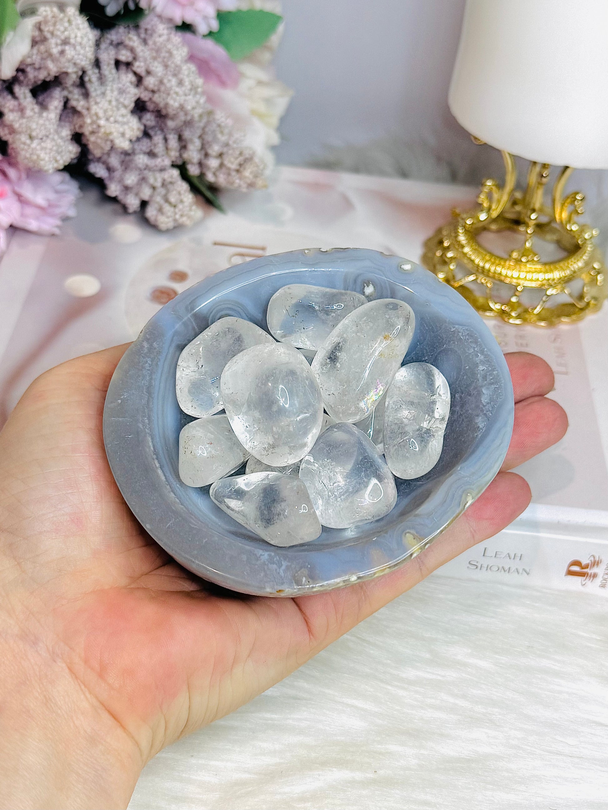 Natural Agate Carved Bowl Filled with Clear Quartz Tumbles 443g