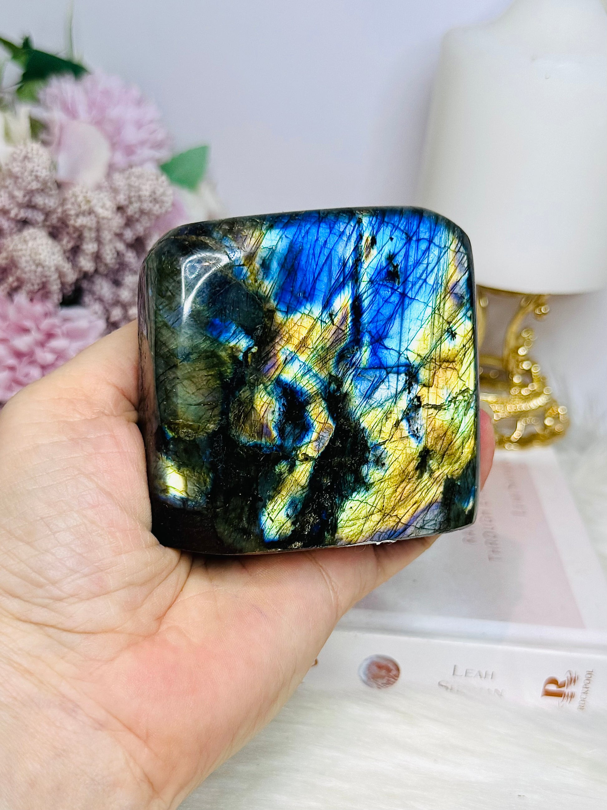 Manifestation ~ Labradorite crystal's hallmark is transformation and change. Viewed as a power stone, allowing one to see through illusions and determine the actual form of your dreams and goals. It is used in magic for manifestation, scrying, and protection - largely associated with the divine feminine.