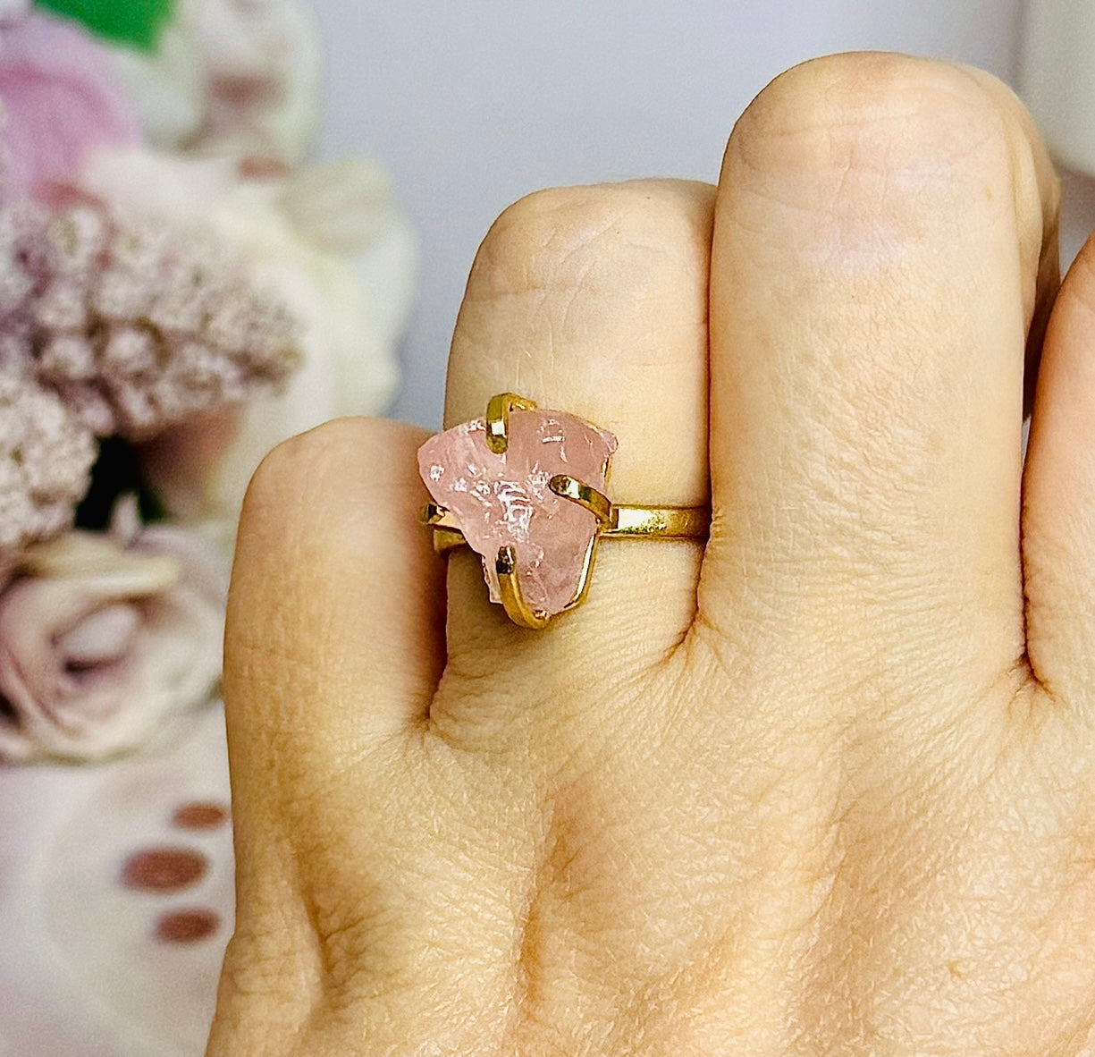 Natural Rose Quartz Gold Plated Adjustable Ring From Brazil ~ In Gift Bag