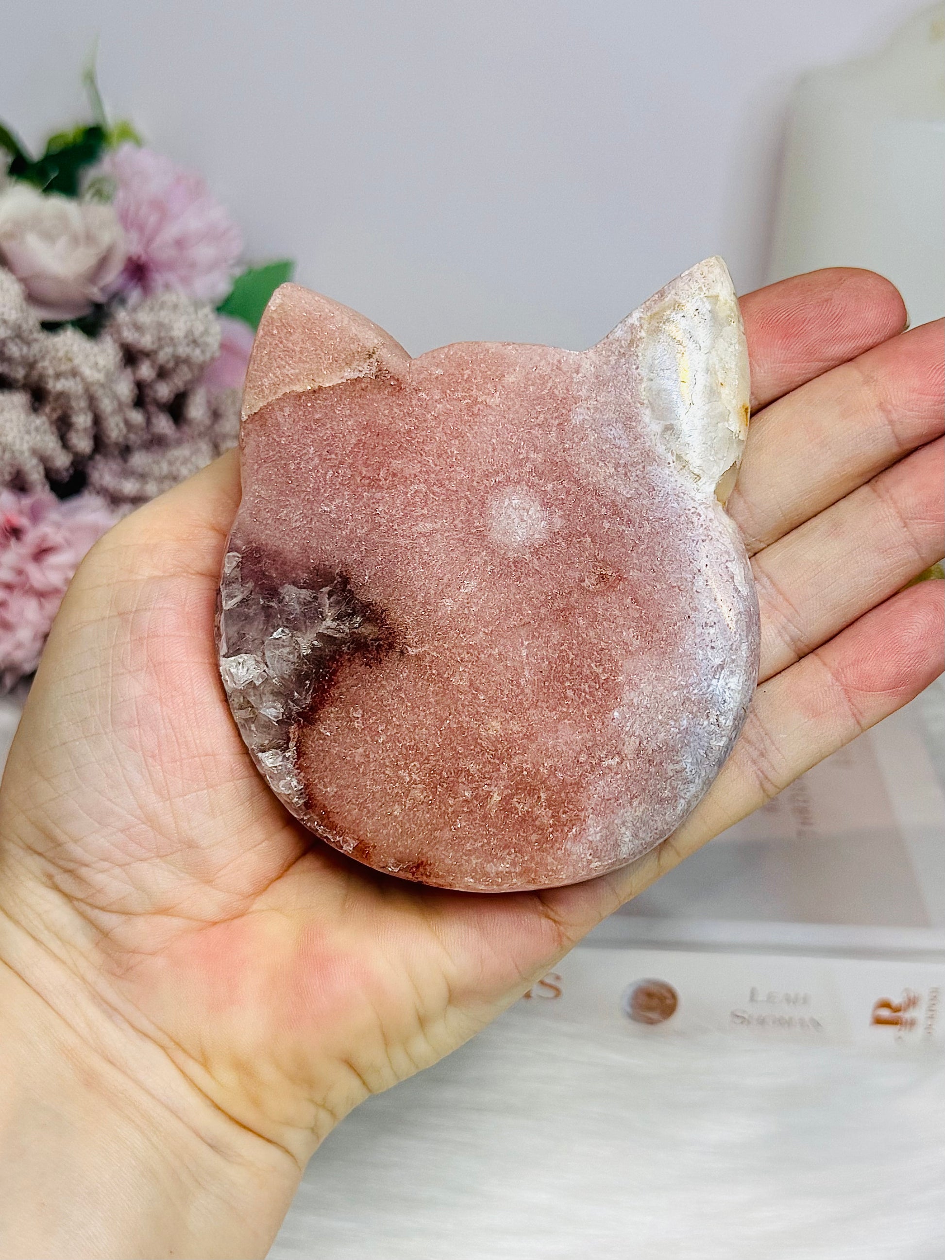 Pink Amethyst Druzy Cat Carving On Stand 9cm 254g