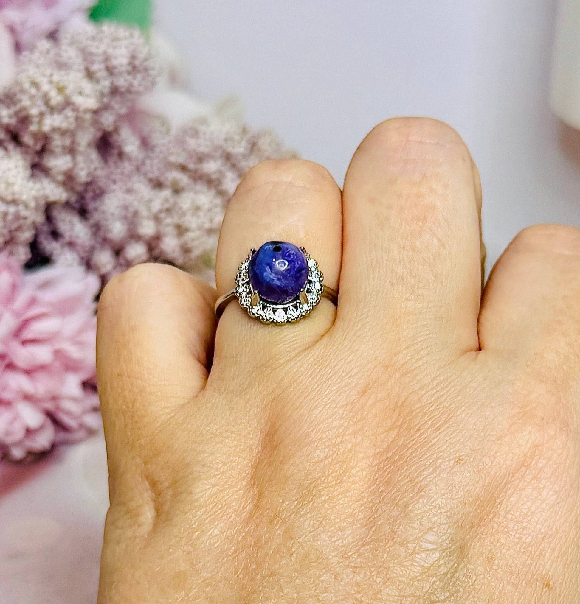 Purple Charoite Adjustable Silver Ring in Gift Bag
